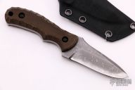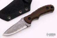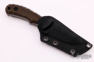 This Shinobi by Kiku Matsuda features a drop point blade with false top edge and notched thumbrest, .195" blade stock and 1.288" blade depth, full tang construction. The handle has brown canvas micarta scales, lanyard hole. Comes with a kydex sheath. Excellent condition.