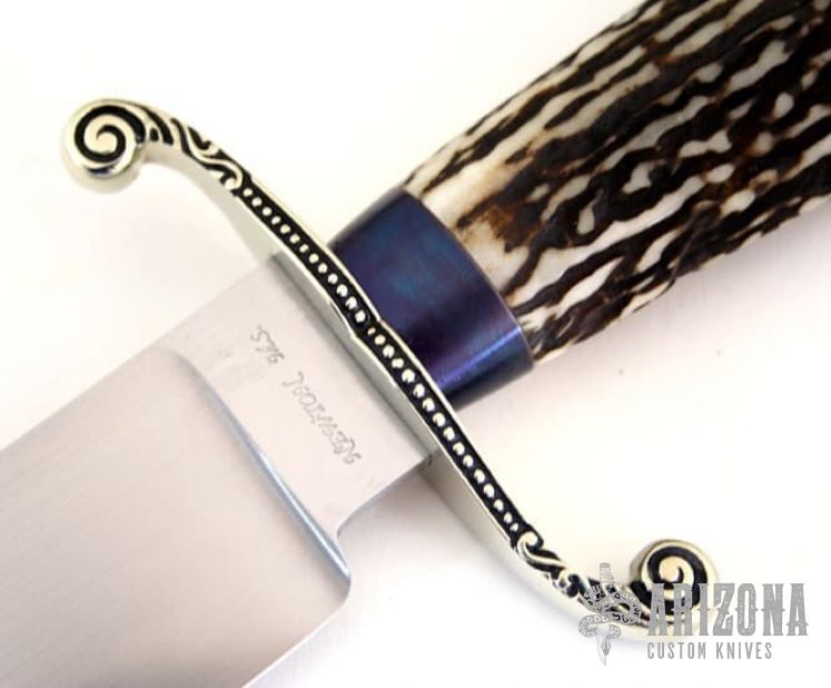 3/16" blade thickness and 1 1/2" blade depth. The blade has a 1000 grit hand-rubbed satin finish and is flawless. False top edge. Excellent hand carved nickel silver guard with scroll engraving. Heat blued front ferrule and butt cap. The nickel silver rear finial knob allows complete disassembly of the knife. The handle is premium India sambar stag and has a great look and feel. Outstanding work. Direct from maker. Blade Steel: 1095 Hand Forged