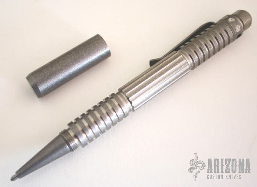 This is Rick Hinderer's new "Extreme Duty Pen", an upgraded version of his Modular Kubaton model. Rick describes some advantages of this new model:"This pen is shorter overall than the Modular Kubaton with pen attachment, this will make this pen easier to write with but still making it a very formidable weapon. This pen is also using the larger Fisher Space pen refill, which means more writing between refills. The top end of this pen still retains the threading for the Modular Kubaton attachments so you can still use the same attachments to do up your pen the way you want it."