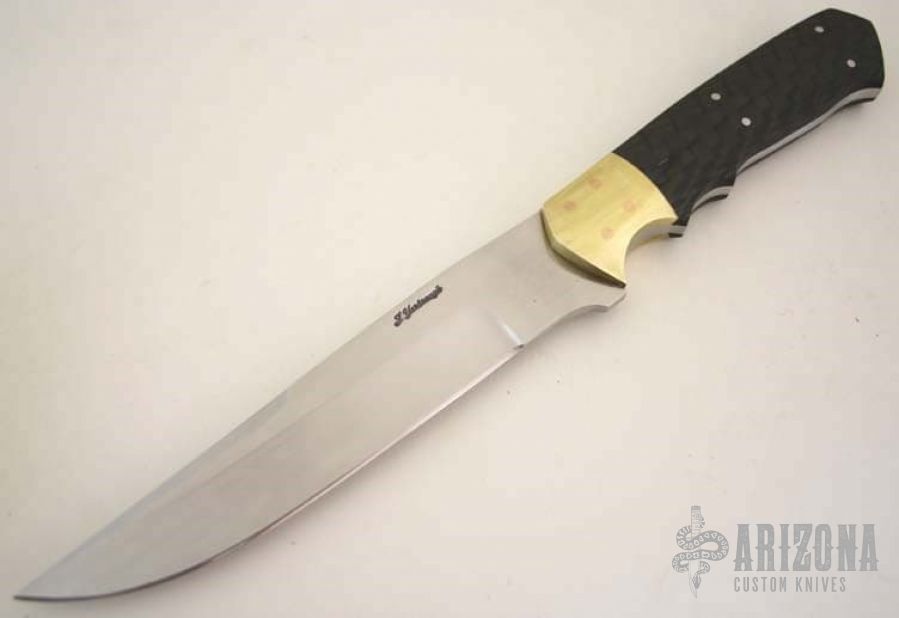 This fighter features a satin finish ATS-34 blade with a false top edge, brass bolsters and carbon fiber scales from an Apache helicopter. Full tang construction. Finger grip handle. Very nice work. There are a few minor scratches on blade and bolsters. Blade Steel: ATS-34