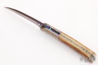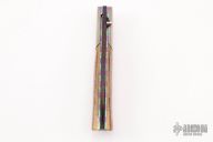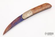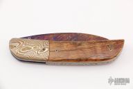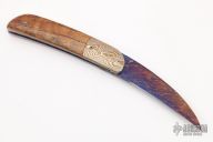 This Linerlock Folder from Theuns Prinsloo features a blued Damascus hawkbill blade with a single thumbstud with ruby inset. The handle has dovetailed mokume bolsters, mammoth ivory scales, fileworked and anodized titanium liners, heat colored and engraved stainless steel backspacer. Nice detent, lockup and blade seating. Excellent condition.