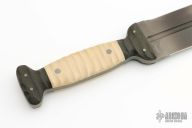 This One Off Gladius Sword by Duane Dwyer features a tiger striped double edged blade with fullers, .300" blade stock and 2.033" blade depth, full tang construction. The handle has carbon fiber bolsters and ivory paper micarta scales. Has a few scuffs, otherwise excellent condition.