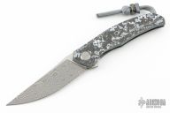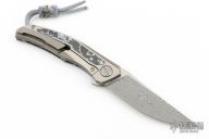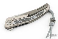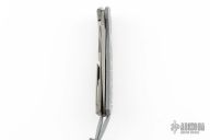 This Quantum by Shirogorov features a ZDI-E blade with notched thumbrest and flipper. The handle has a stonewashed with polished flats Titanium frame with White CarboTi presentation scale, backspacer, tip up titanium clip with hidden screws. Rides on MRBS, nice detent, lockup and blade seating. Comes with original box and COA. New condition.