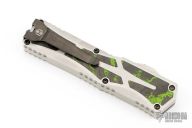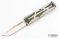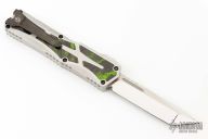 This Colossus by Heretic Knives features a mirror polished tanto blade with satin flats and fullers. The handle has a two-tone stainless steel frame with Camo Carbon Toxic Green carbon fiber inlays, stainless steel thumb slide with matching carbon fiber inlay, stainless steel tip down clip. Comes with original box, zippered case and COA dated 3/223 and s/n 013. Excellent condition.