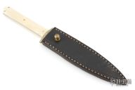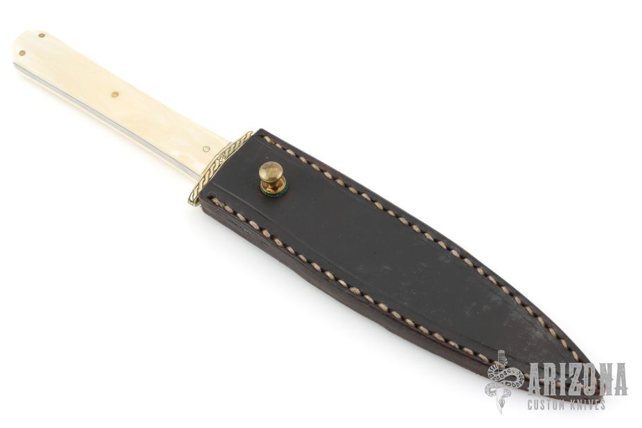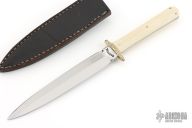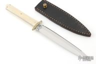 This One of a Kind Engraved Dagger by Bill Bagwell features a double edged mirror polished blade with .182" blade stock and .967" blade depth, full tapered tang construction. The handle has an engraved brass guard with mammoth ivory scales and brass pins. Comes with a black leather sheath and a zippered case. Double Extra Forged stamped on the blade. The guard has been engraved by Bill Bagwell which is very rare. We were told this is the only knife he ever engraved. It can bee seen in catalog #3 as "San Francisco Dagger". Has some light spot on the blade, otherwise excellent condition.