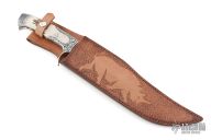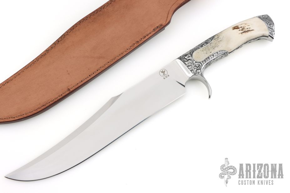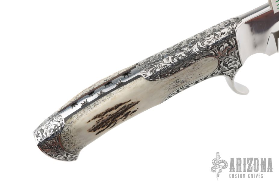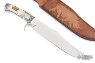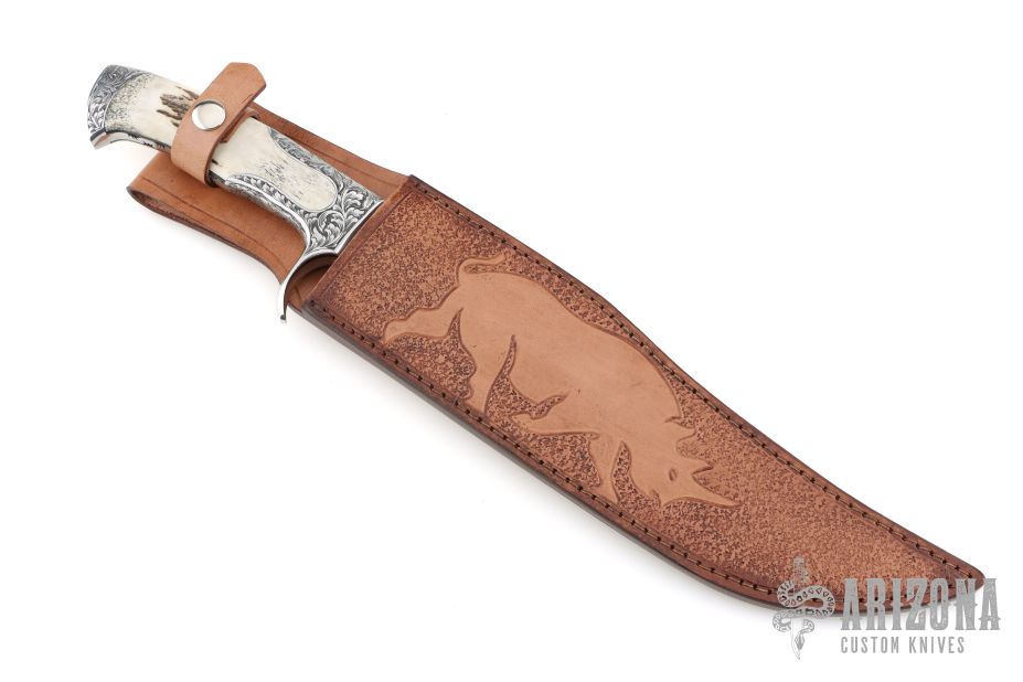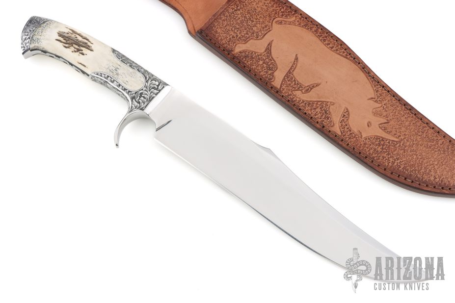 This Integral Defender Fighter by Black Ore Knives features a mirror polished blade with false top edge, .209" blade stock and 2.009" blade depth, full integral construction. The handle has integral engraved guard and rear bolsters, fully fileworked tang, and stag scales. Comes with a hand tooled brown leather sheath and a zippered case. New from maker.