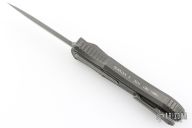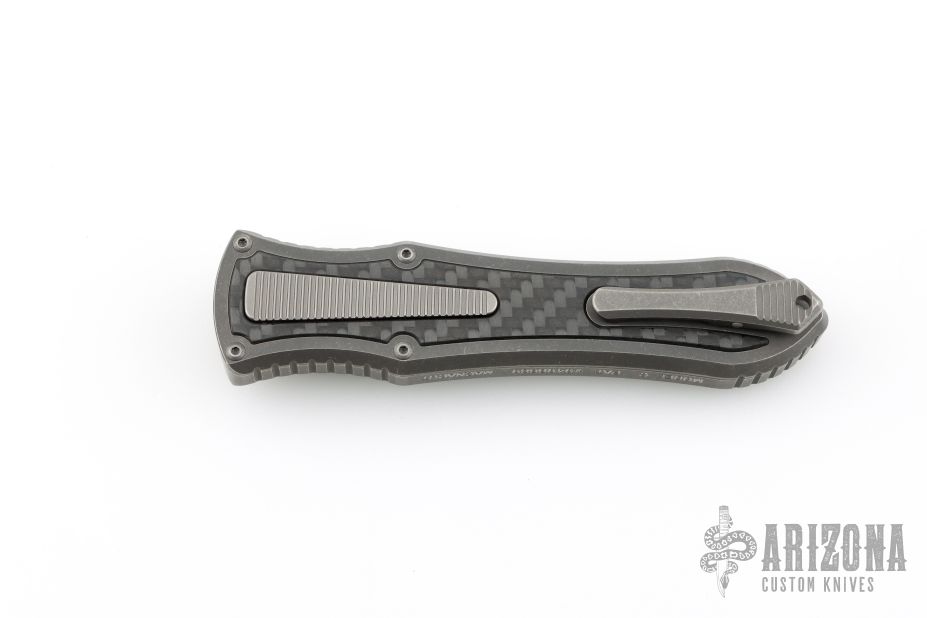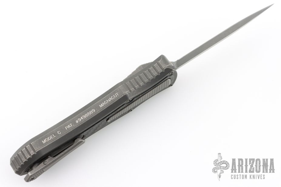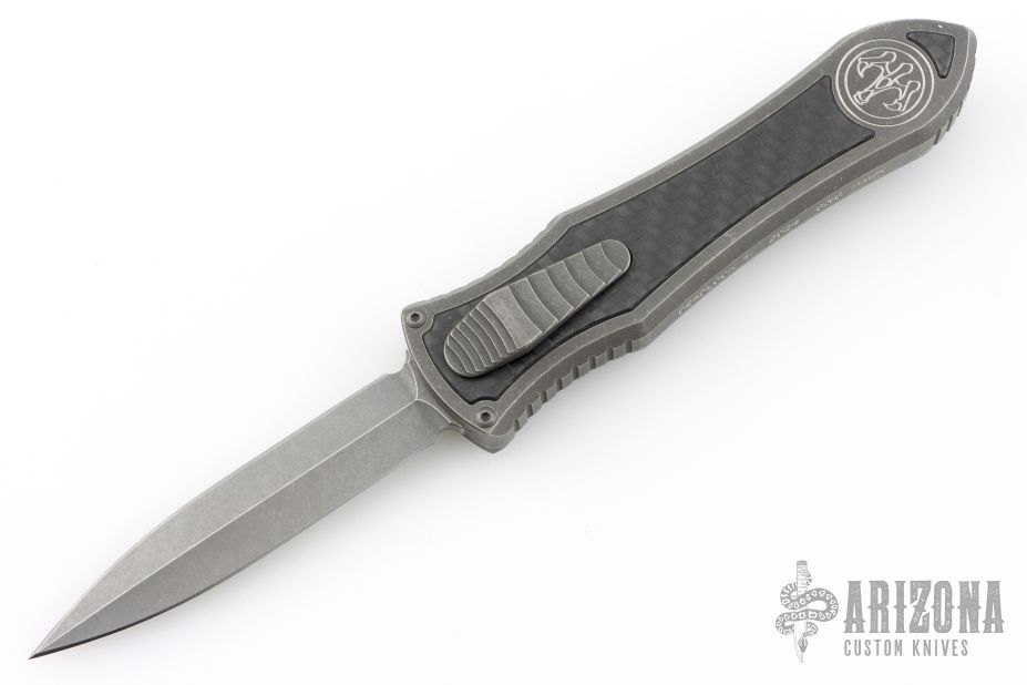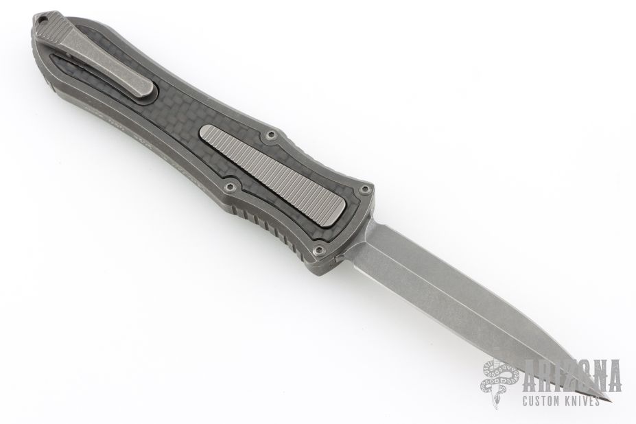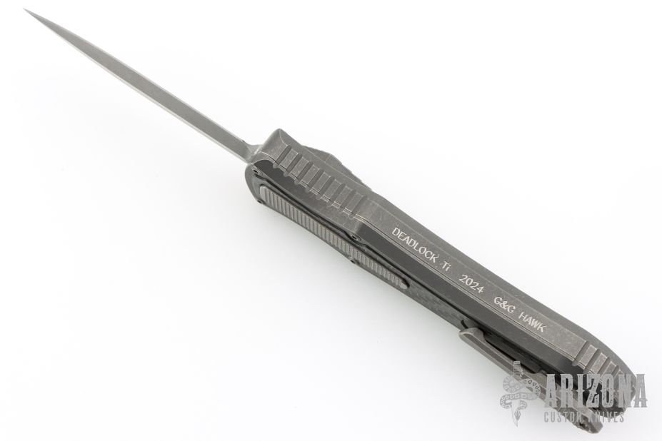 This knife is a Deadlock Model C by Grant and Gavin Hawk. It has a double-edged blade. The handle has a Carbon fiber inlays in the stonewashed titanium frame with a tip down spring clip, titanium. The thumb slide on the handle is also stonewashed titanium. Comes with original zippered case, tool and card. Grant and Gavin Hawk set out to create a double action OTF with no blade play.... They did it, NO blade play. Excellent condition.