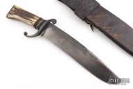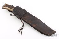 This Large Bowie by Master Smith Daniel Winkler features a forged and blued carbon steel blade with hammer marked flats and false top edge, .327" blade stock and 2.023" blade depth, full tapered tang construction. The handle has a forged steel S-Guard, elk antler scales with hammered copper and leather wrap, copper liners, forged steel butt. Comes with a hand tooled brown leather sheath with a rawhide leather wrap and copper rivets. Has a few light scratches, otherwise excellent condition.