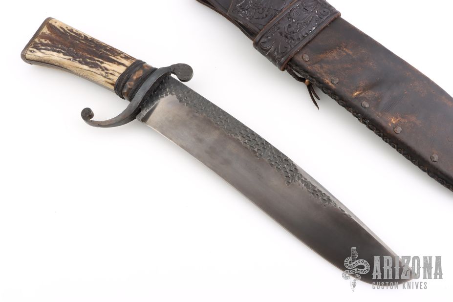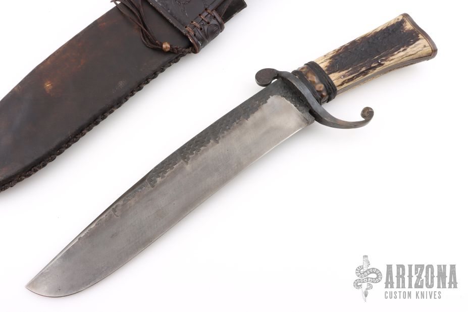 This Large Bowie by Master Smith Daniel Winkler features a forged and blued carbon steel blade with hammer marked flats and false top edge, .327" blade stock and 2.023" blade depth, full tapered tang construction. The handle has a forged steel S-Guard, elk antler scales with hammered copper and leather wrap, copper liners, forged steel butt. Comes with a hand tooled brown leather sheath with a rawhide leather wrap and copper rivets. Has a few light scratches, otherwise excellent condition.