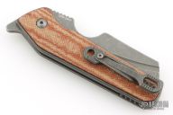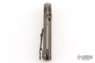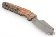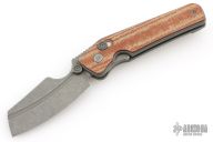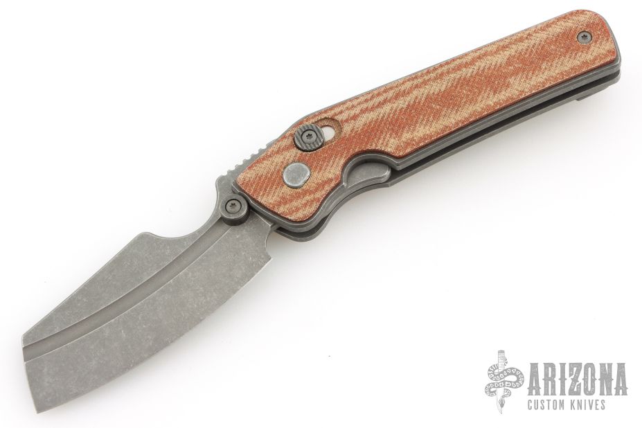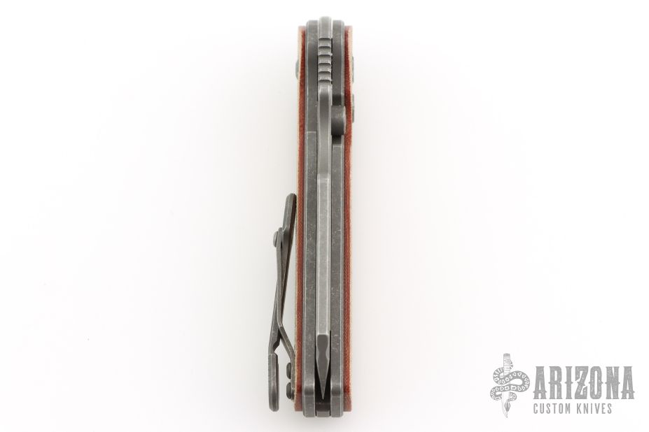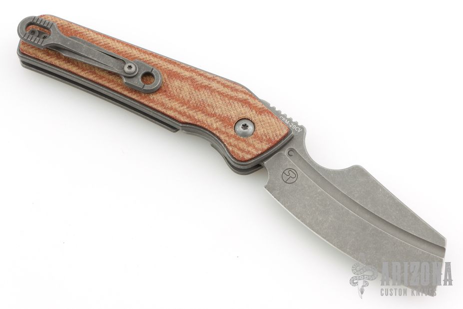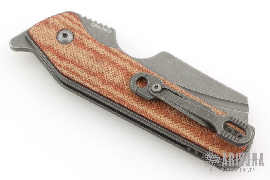 This custom Rook flipper is a gorgeous design from Serge Panchenko. It's a full custom knife handmade by Serge in his Sacramento shop. The 2.95" reverse tanto blade is made from CPM-20CV stainless steel with a stunning dark stonewash finish. The handle is made from a milled titanium frame with checkered Richlite onlays for a fantastic pop of color. The action created by the flipper tang is light, crisp, and extremely fast. This blade jumps out of the handle like a rocket and locks up nice and tight. Comes in a nylon zipper pouch with maker's card. Excellent condition.