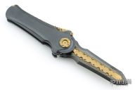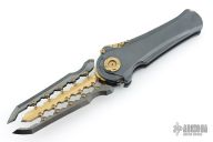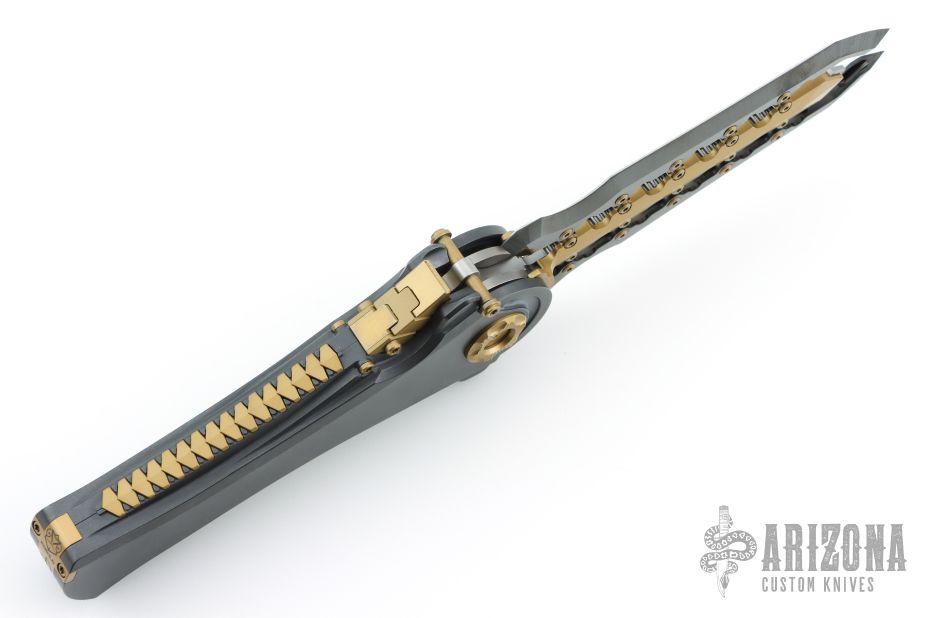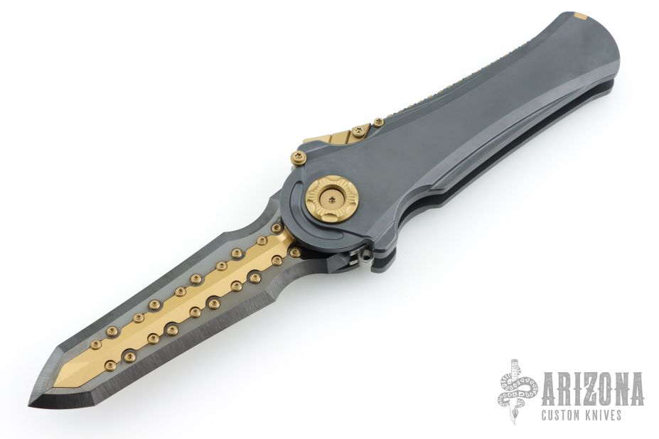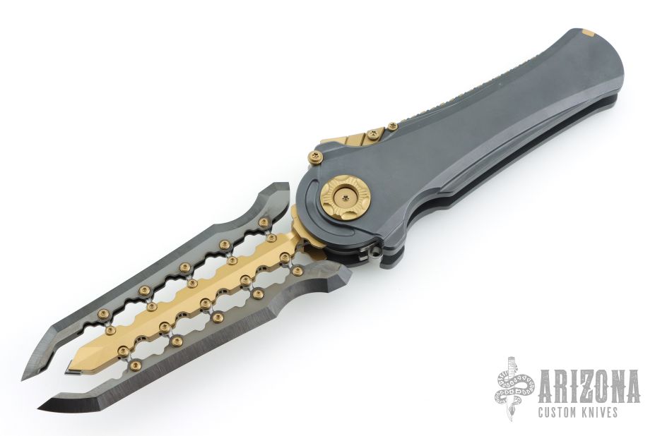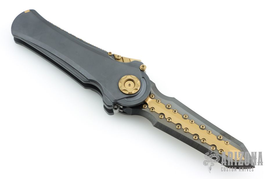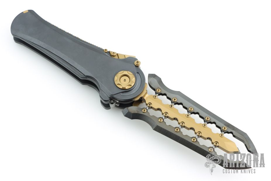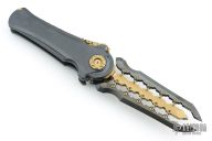 To open it, pull down and back on the segmented protrusion at the top of the spine. This will disengage two locks and allow the blade to swing freely. That's when the sound and feel come into play: Two tuning fork-like components inside each side of the handle vibrate and ring whenever the knife is opened or closed, adding to the alien vibe and making it seem like it has an inner energy. Said vibe is further enhanced by the detailing on the knife's spine, all machined from titanium.