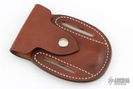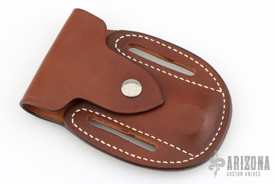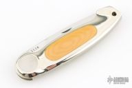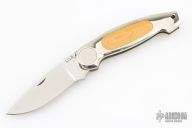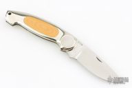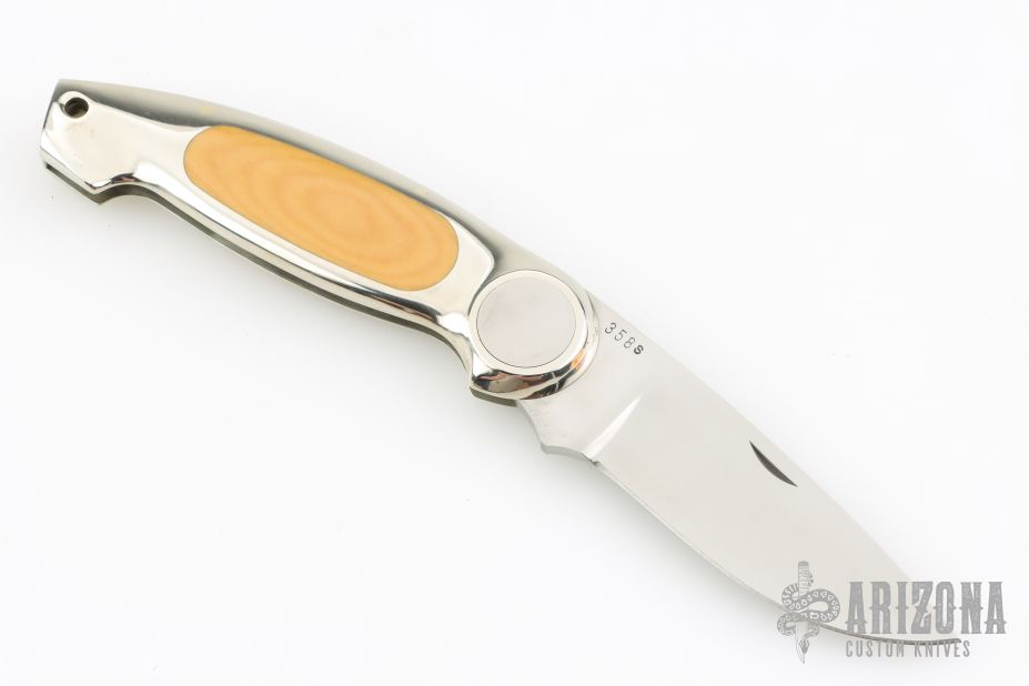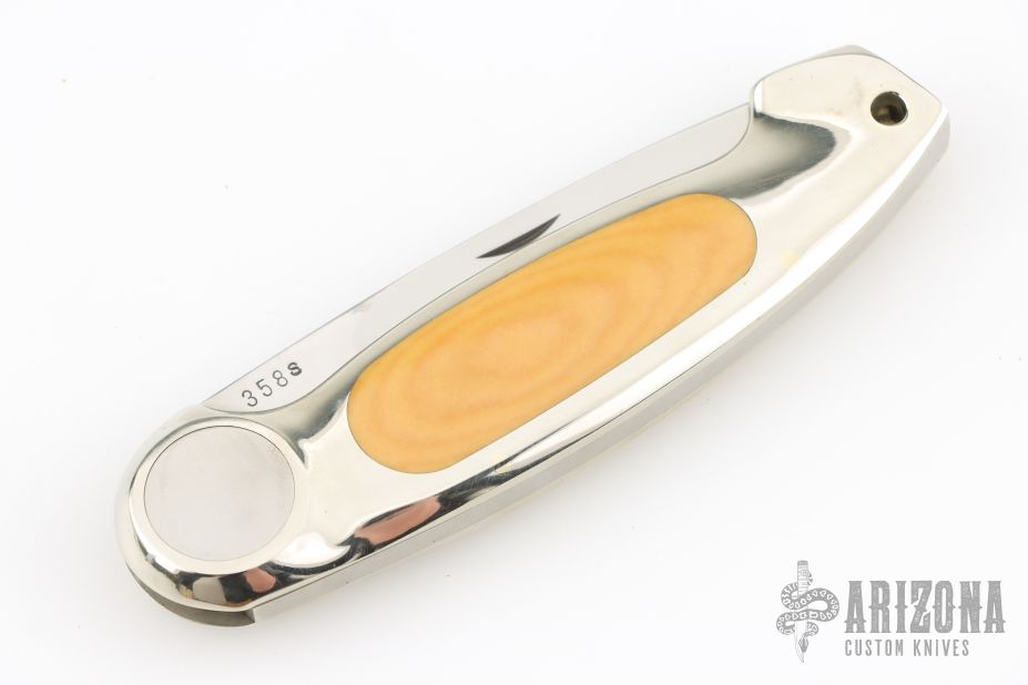 This Button Lock Folder from Jimmy Lile features a satin finished blade with nail nick, #358S on blade. The handle has a nickel silver frame with ivory paper micarta inlays. Large button lock release mechanism used to open and close the knife. Numbered "80" on inside of backspacer. Excellent condition. Comes with a brown leather sheath.
