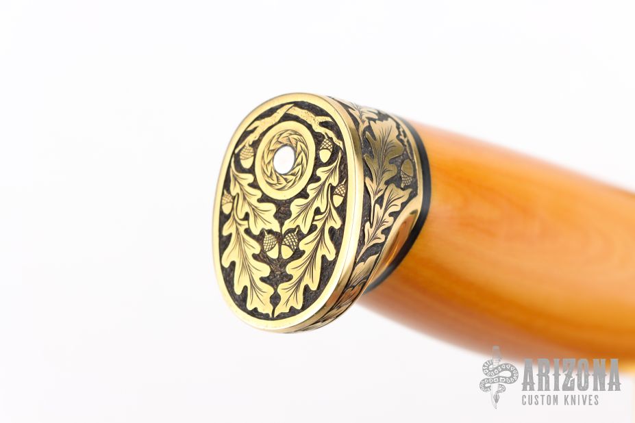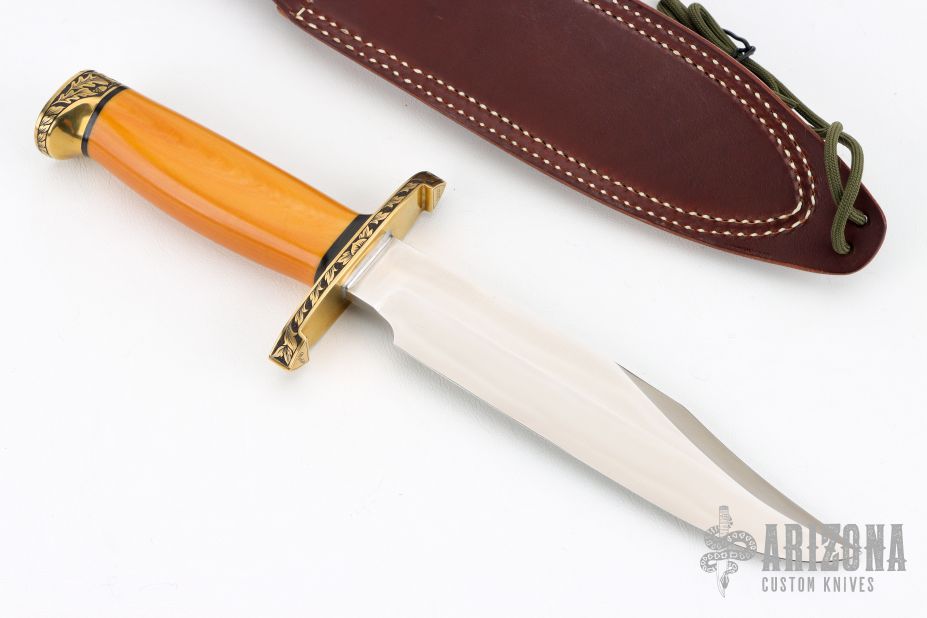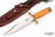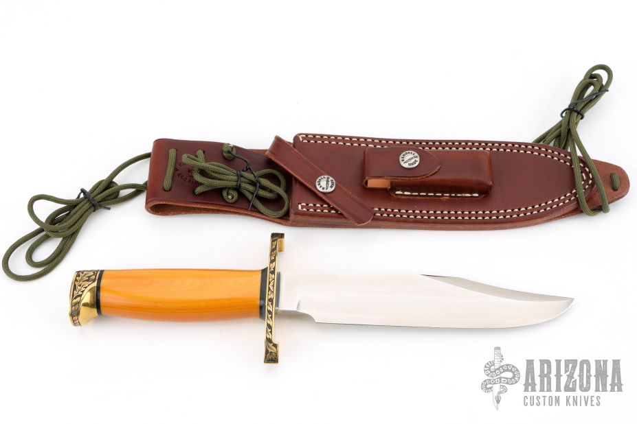 This Model 14 from Randall Made Knives features a satin finished clip point blade with sharpened top edge, .228" blade stock and 1.388" blade depth, full tang construction. The handle has a lugged brass guard, yellow linen micarta handle, black spacers and a brass crows beak butt. The guard and butt have been hand hammer and chisel engraved by Medini of Italy, acorn leaf and acorn engraving with black bead background. Comes with a brown leather sheath and a zippered case. Excellent condition.