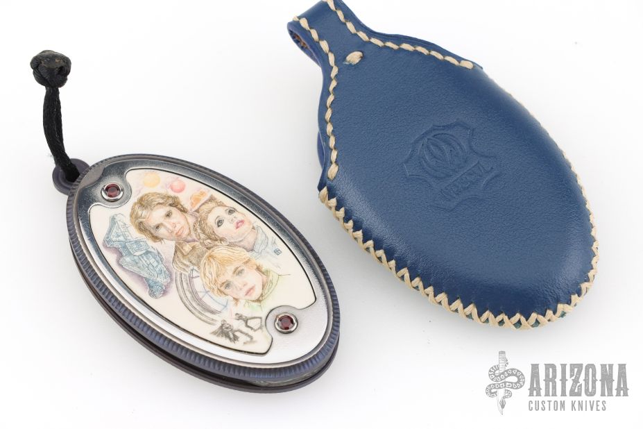 The frame is made of engraved titanium, lightweight yet extremely durable, with engraving completed by master artisan Yuriy Shaplovsky. The handle inserts are made from genuine fossil mammoth ivory and decorated with handmade scrimshaw artwork by renowned scrimshaw artist Galina Chernysheva. Natural gemstones are used as decorative accents, giving the piece a true jewelry-level finish.