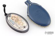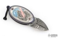 The knife is a unique, one-of-a-kind collectible folding pendant, designed as a wearable piece of art with no copies or reproductions. The blade is crafted from laminated high-carbon steel with outer layers of mosaic Damascus, forged by master bladesmith Vlad Matveev, offering exceptional strength, sharpness, and a refined Damascus pattern.