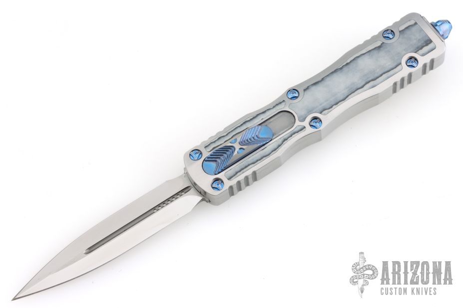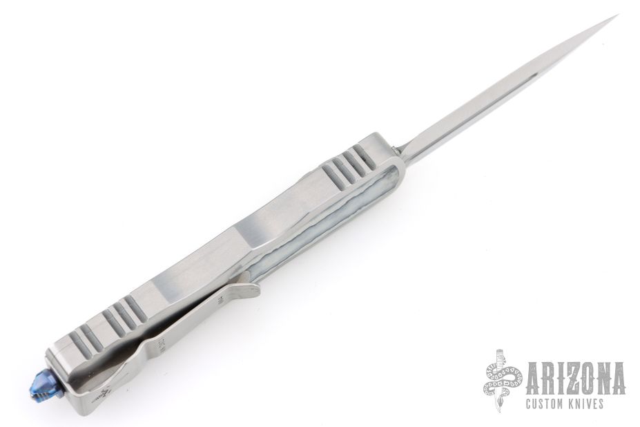 This Dirac by Marfione Custom Knives features a mirror polish finish double-edged blade. The handle has satin finish steel handle with blue titanium hardware, carboquartz inlays, tip down stainless steel clip. Comes with original box, zippered case and papers. COA dated 08/2020  S/N 004. Excellent condition.