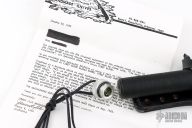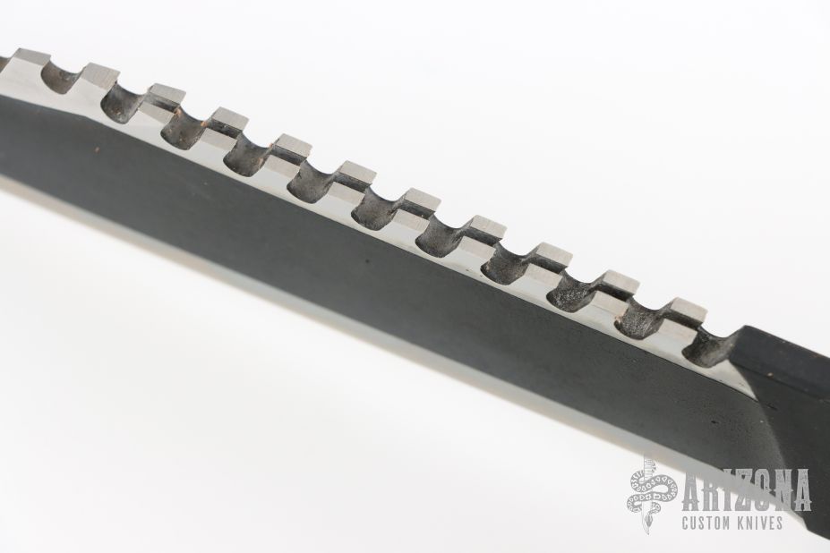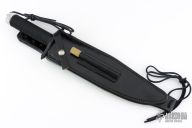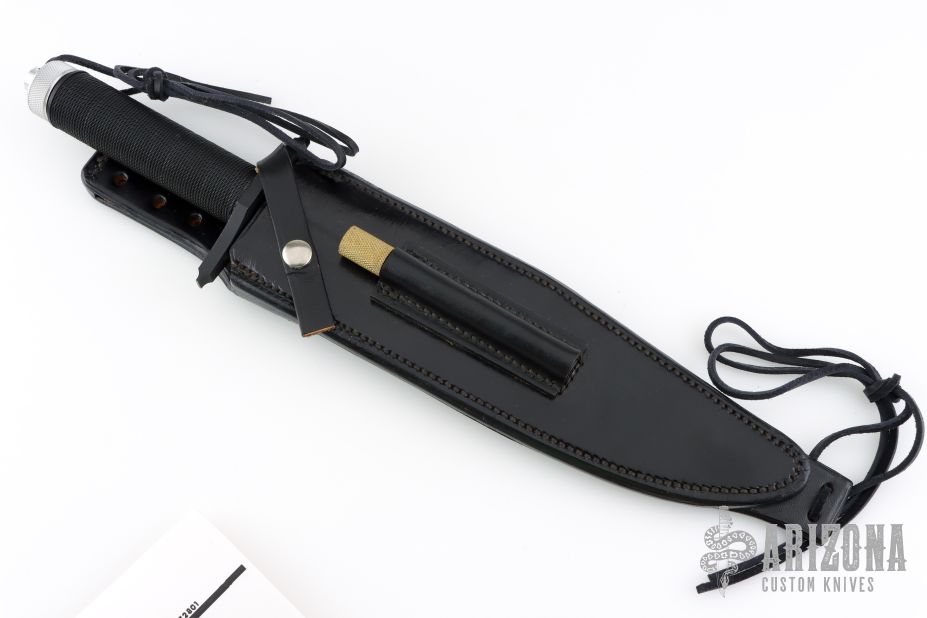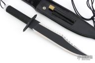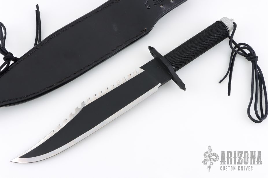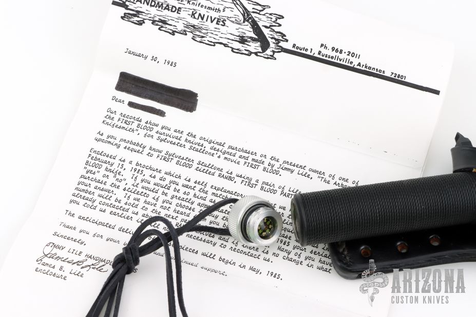 This Rambo Mission knife by Jimmy Lile was featured in the movie "Rambo, First Blood Part II". It features a two tone blade with black center and satin grinds, 14 saw-teeth on blade spine, .247" blade stock and 1.907" blade depth, hidden tang construction. The handle has a black stainless steel double guard with flat and Phillips head screwdrivers, hollow cord wrapped handle, and aluminum removable butt cap with an O-ring to make it water-proof and a compass. Comes with black leather sheath that has an EZ-LAP sharpening steel in the sheath. The blade is stamped "065". Excellent condition. Comes with nylon zippered case, and two letters from Jimmy Lile confirming the order for the knife dated January 30, 1985.