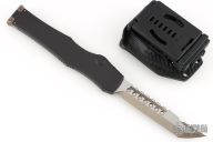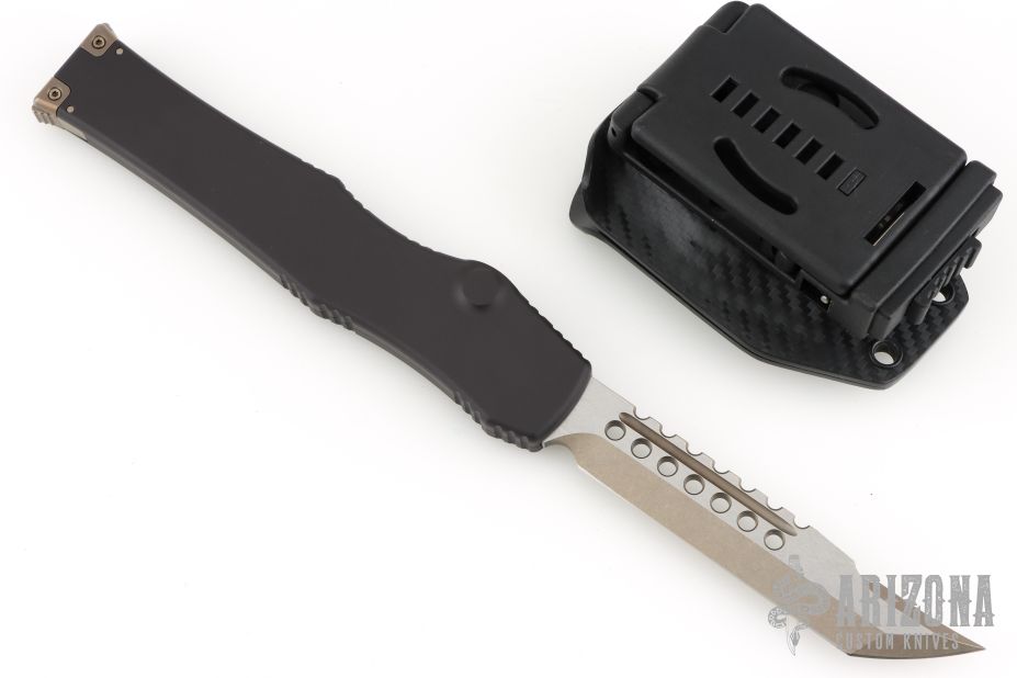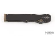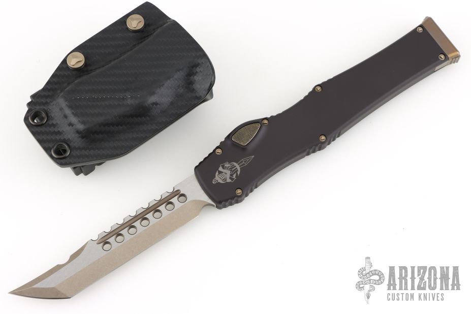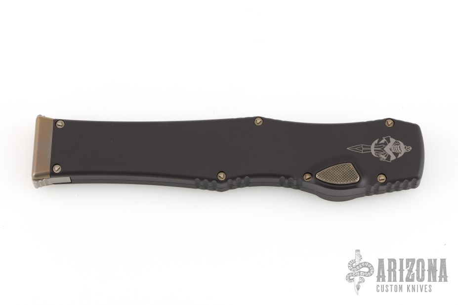 This Signature Series Halo VI features a bronzed Hellhound tanto blade with satin flats, fullers and notched spine. Its handle is made from black Mil-Spec anodized alloy with bronzed hardware. The charging handle comes marked with the Microtech logo and date of creation along with the serial number. Microtech's Halo VI sets itself apart from previous models with added safety features and an improved charging handle mechanism. . Its upgraded charging handle is built with dual pivoting latches that create a secure seal in the closed position. Comes with original box, kydex sheath and papers. Dated 09/2018. Excellent condition.