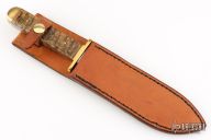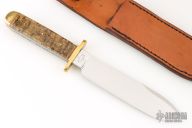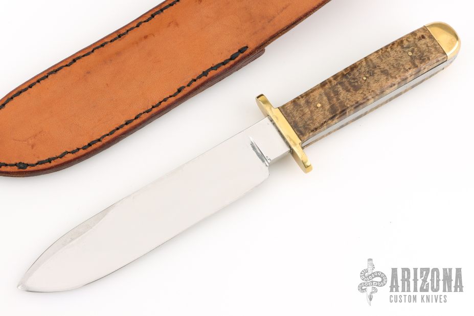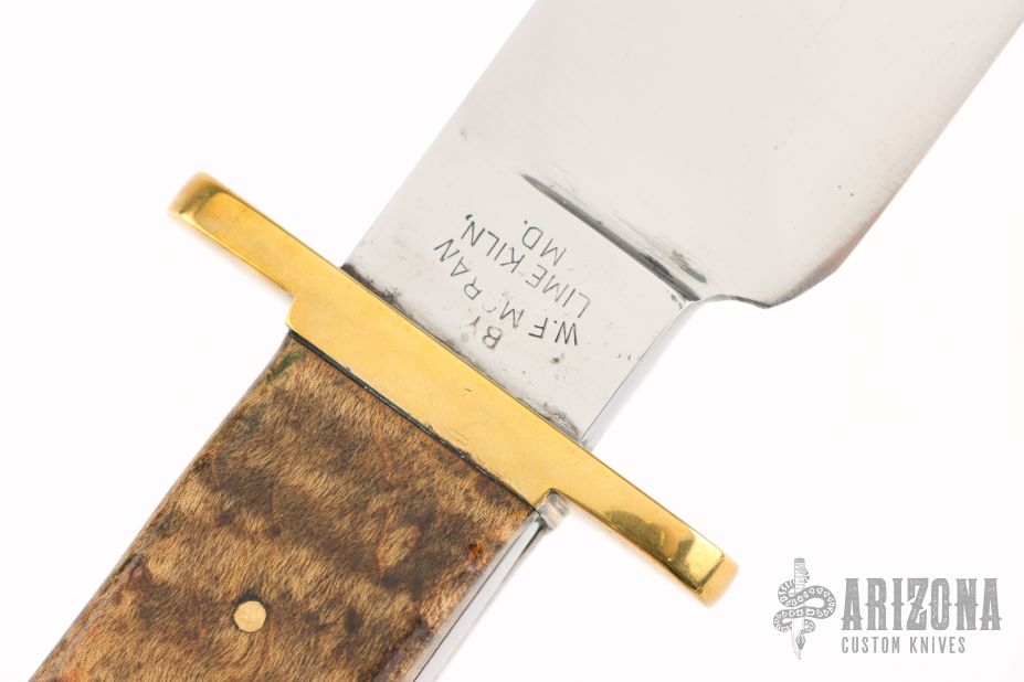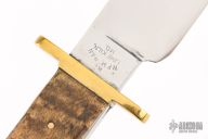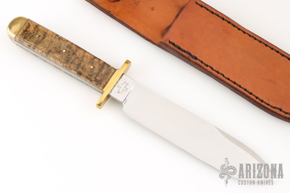 This Rio Grande Camp Knife by Master Smith Bill Moran features mirror polished blade with false top edge, .294" blade stock and 1.356" blade depth, full tang construction. The handle has a brass guard and rear bolsters, curly maple scales. Comes with a brown leather sheath and zippered case. Has a little patina and a few scratches, otherwise excellent condition for its age. Made in Lime Kiln MD.