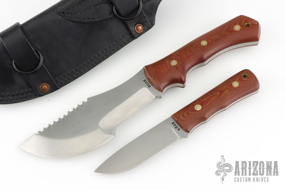 This is an original WSK tracker made by Dave Beck that is made to the same specs as the knife used in the movie "The Hunted". It features a hand rub satin finished blade with saw teeth on blade spine, .243" blade stock and 2.421" blade depth, full tang construction. The handle has brown linen micarta scales with lanyard hole. H034 on the blade. Includes original Dave Beck right hand draw wolverine black leather sheath with copper rivets that holds the companion blade as well. The companion blade has a hand rub satin finished blade with .119" blade stock and 1.177" blade depth, full tang construction with brown linen micarta scales. #162 on the blade. 4.125" blade and 8.5" overall. Excellent condition. This is Dave's most popular and sought after model and has been discontinued.
