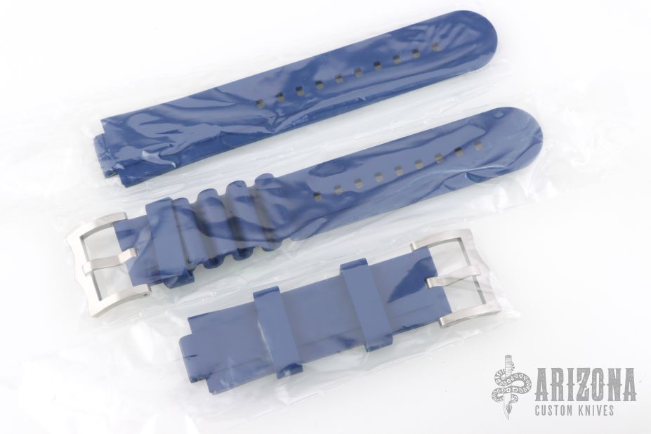 Complimentary blue rubber strap with buckle and extra extension piece supplied with watch