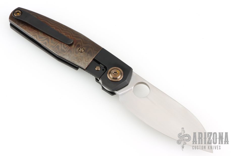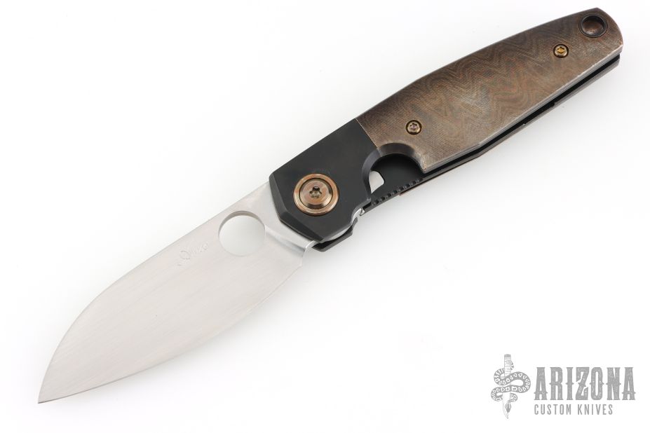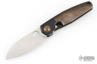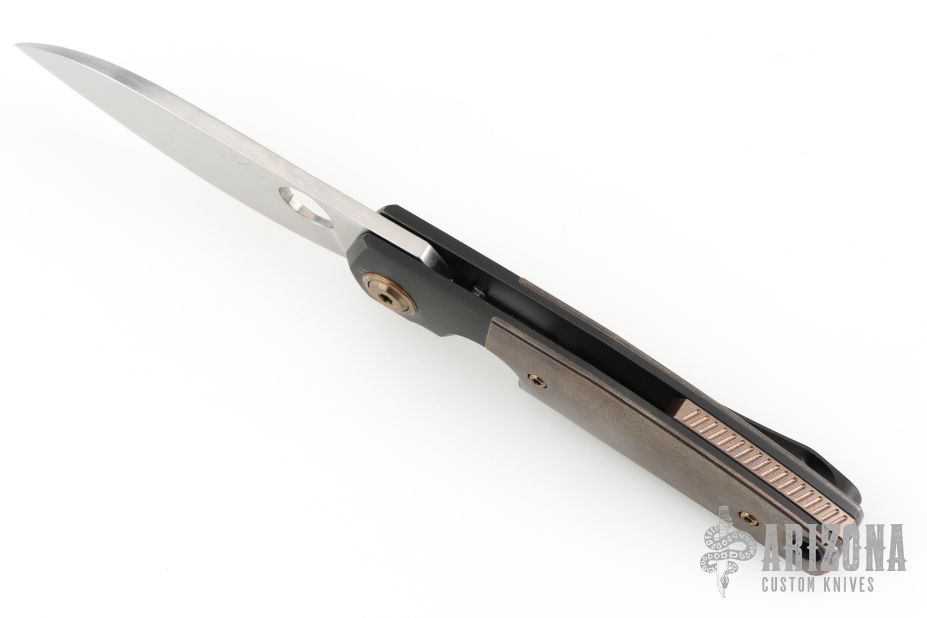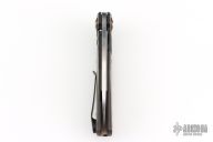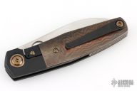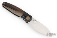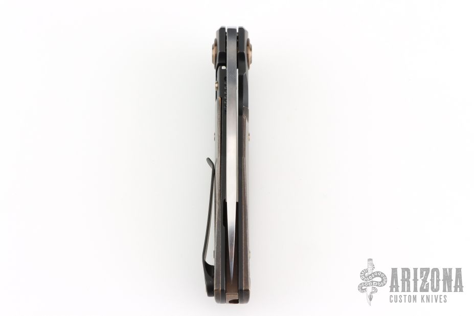 This Sonic by Jens Anso features a hand rub satin finished blade with thumbhole. The handle has a fine checker milled DLC titanium frame and tip up clip, Mokume scales and backspacer with lanyard hole on one side of the frame, anodized titanium hardware and pivot collars. Nice detent, lockup and blade seating. Rides on bronze washers. Comes with original box and COA dated Nov 2025. Excellent condition.