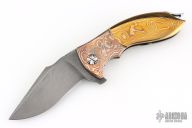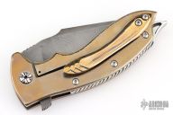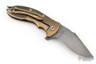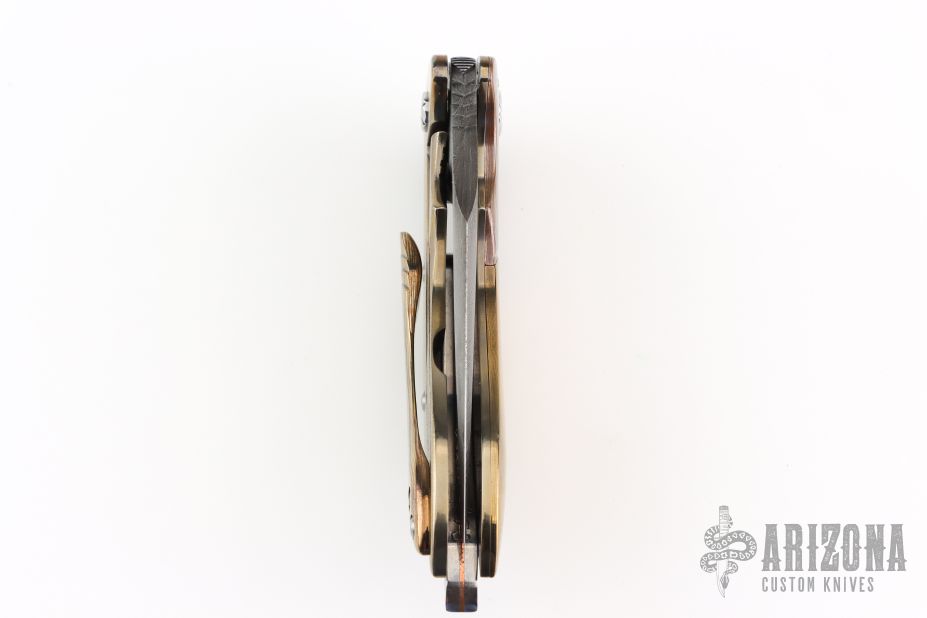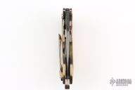 This Praymantis framelock flipper by Alistair Bastian features a Damascus (1070 and 15N20) blade with a fileworked thumbramp and a checkered flipper. The handle has a Mokume (copper and iron) bolster and scale, polished and fileworked pivot, anodized titanium liner and orange peel finished frame, tip up Mokume (copper and iron) clip, and fileworked stainless steel backspacer with copper stripe down the middle. Comes with nylon zippered case and COA dated 08/2015. Rides on caged bearings. Nice detent, lockup and blade seating. Excellent condition.