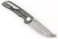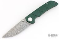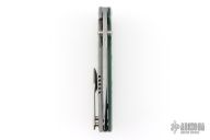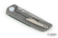 This one of a kind Mini Chaos by WR Bladeworks features a ladder pattern Damasteel blade with false top edge and dual thumbstuds. The handle has an emerald green paper micarta and bead blasted titanium frame, custom titanium pivot with mother of pearl inlays, Damasteel backspacer and tip up satin titanium clip. Rides on ceramic bearings, nice detent, lockup and blade seating. Comes with pouch and COA dated 8-14-23. Has a couple very light scuffs, otherwise excellent condition.