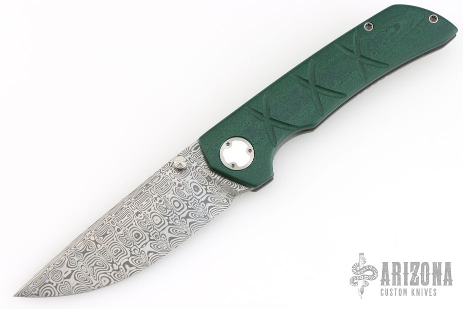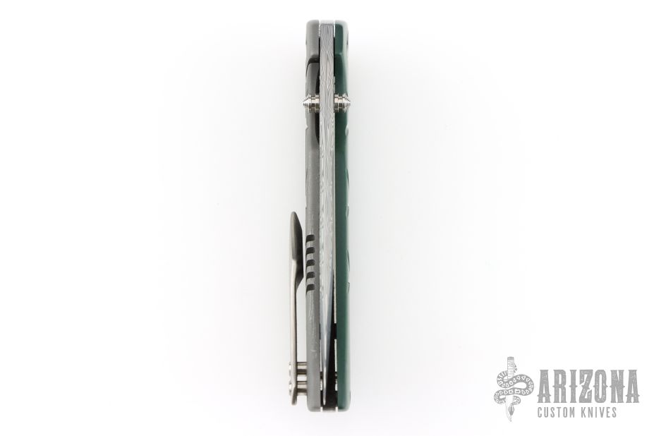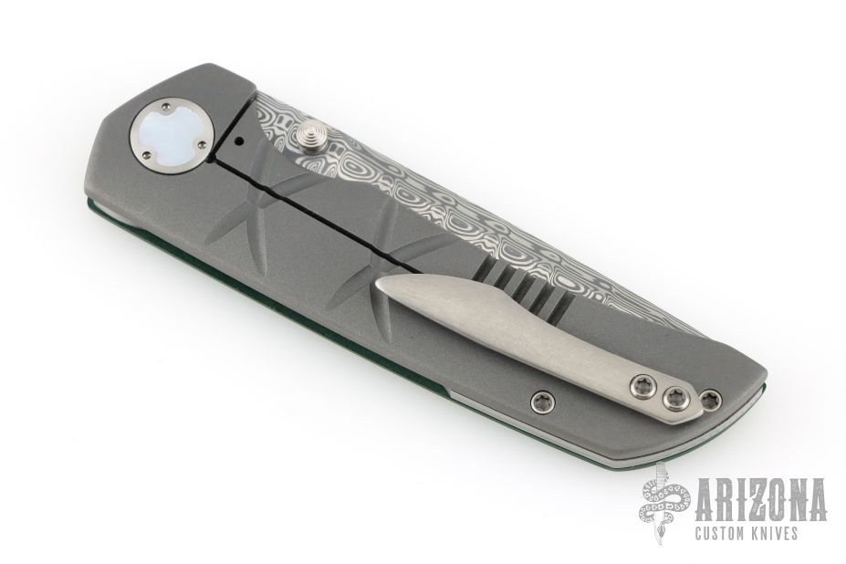 This one of a kind Mini Chaos by WR Bladeworks features a ladder pattern Damasteel blade with false top edge and dual thumbstuds. The handle has an emerald green paper micarta and bead blasted titanium frame, custom titanium pivot with mother of pearl inlays, Damasteel backspacer and tip up satin titanium clip. Rides on ceramic bearings, nice detent, lockup and blade seating. Comes with pouch and COA dated 8-14-23. Has a couple very light scuffs, otherwise excellent condition.