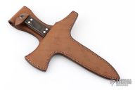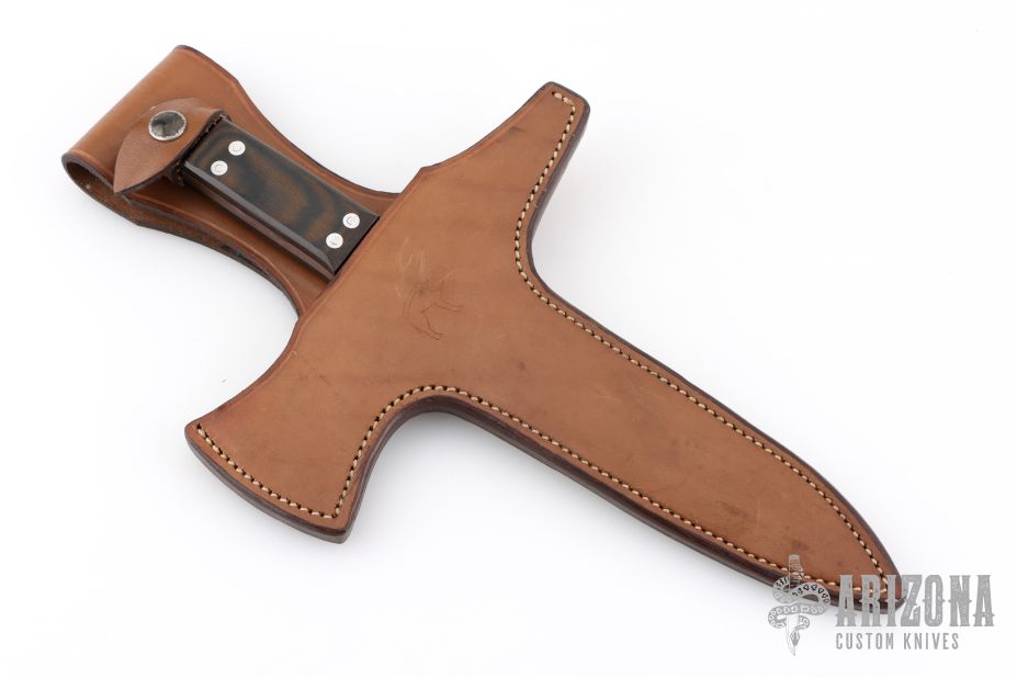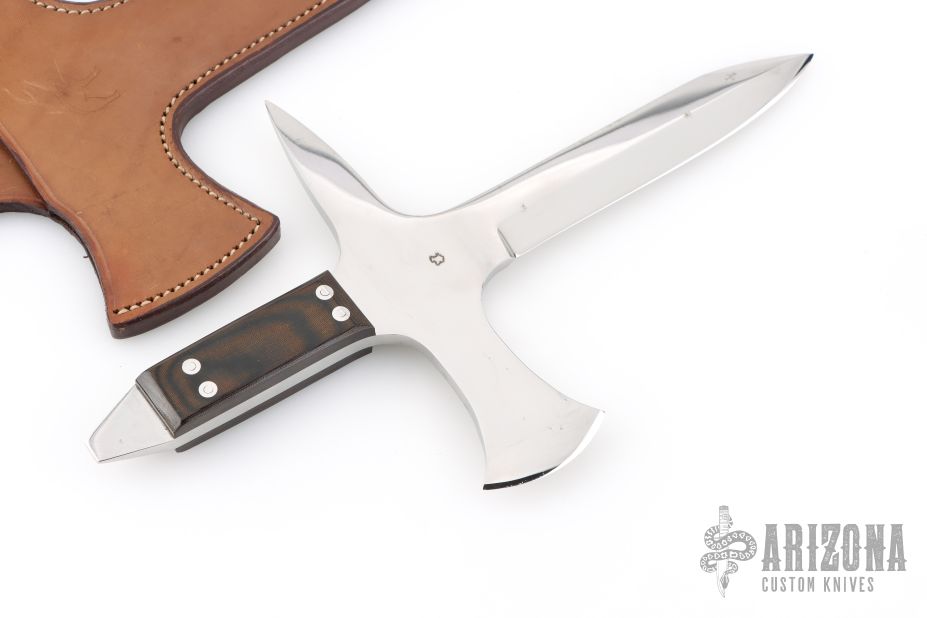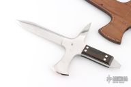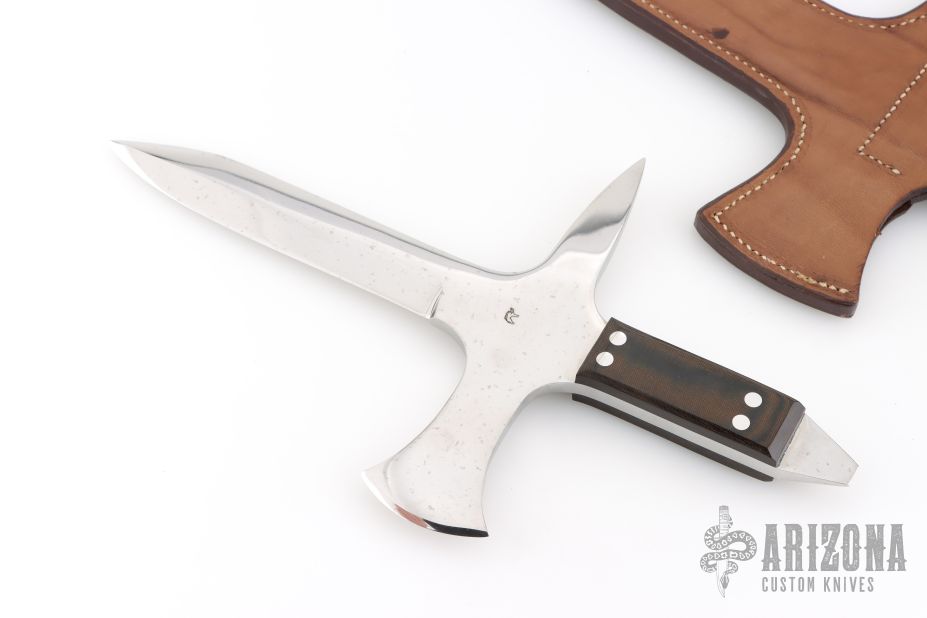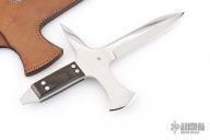 This Le Couteau De Jet (The Throwing Knife) by Jean Tanazacq features a mirror polished blade with false top edge, .245" blade stock and .998" blade depth, full tang construction. The handle has an integral cross guard with a spike on one side and small axe head on the other, black linen micarta scales. Comes with a brown leather sheath with hand tooled wild boar on the front. This knife wears both of his marks, wild boar stamp on one side and map of France on the other. Comes with COA dated 1-18-86. Has some light staining on the blade, otherwise excellent/unused condition. This is the prototype of only three knives that he produced like this.