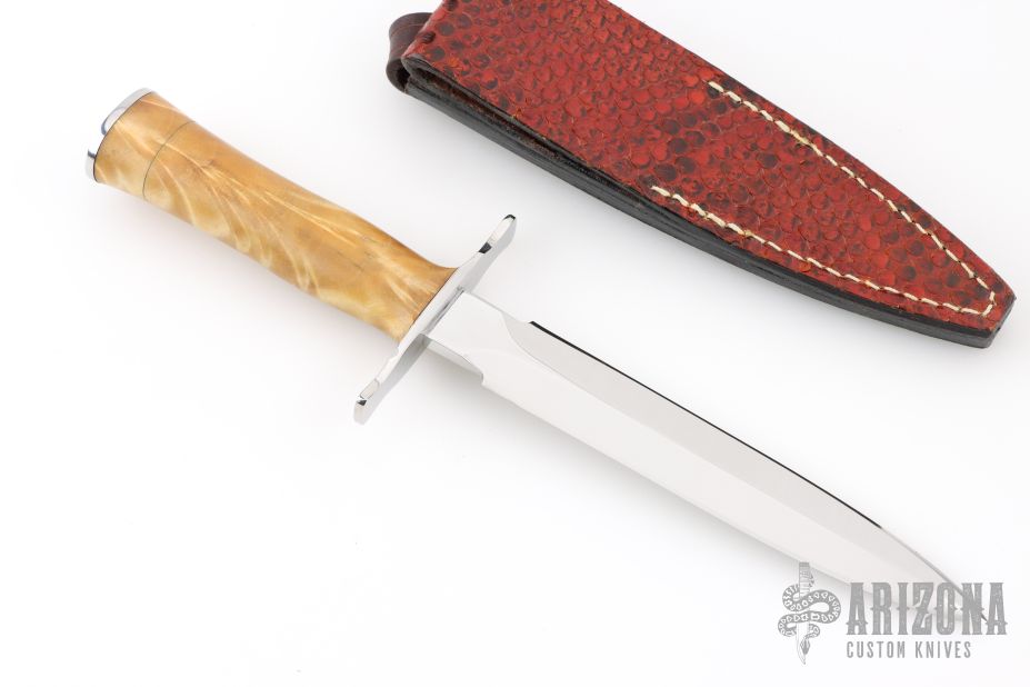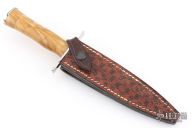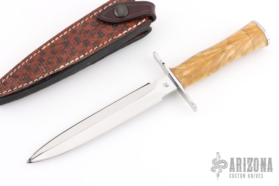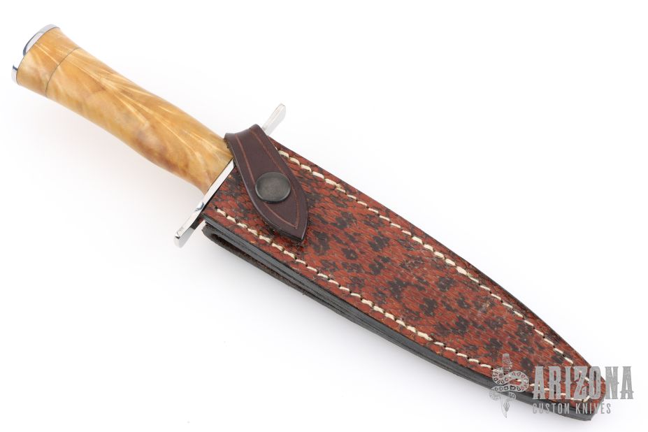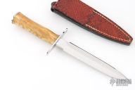 This Le Vengeur Combat Dagger Prototype by Jean Tanazacq features a mirror polished double edged blade with .192" blade stock and 1.005" blade depth, hidden tang construction. The handle has polished stainless steel guard, stabilized poplar wood grip, stainless steel butt. Comes with a brown leather sheath with python skin overlay. Comes with a COA dated 8-20-2002. Excellent condition.