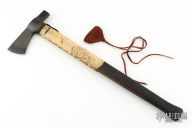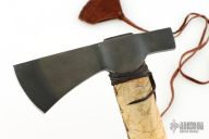 This Tomahawk by Daniel Winkler features a hand forged axe head with high carbon bit, 2.25" blade and 6.5" from edge to hammer pole. The handle is curly maple with raw hide wrap. Comes with a leather blade cover. Marked on the spine of the blade with his makers mark. Excellent condition.