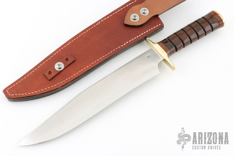 This Warrior Prototype Camp Bowie by Jean Tanazacq features a satin finished blade with .149" blade stock and 1.949" blade depth, hidden tang construction. The handle has polished brass guard, ribbed stacked leather grip, polished brass butt. Comes with a brown leather sheath. Comes with the original design drawings dated 1/28/2019. Excellent condition. This knife wears both of his wild boar stamp.