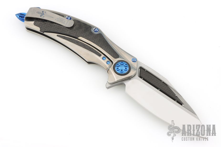 This Super Matrix-R by Marfione Custom Knives features mirror polished grinds, satin flats, and carbon fiber inlays that are floating, notched thumbrest and flipper. The handle has a satin finished titanium frame with seamless carbon fiber inlays and pivot collar, a satin finished titanium clip, tip up carry, and anodized titanium backspacer and hardware. Comes with a nylon zippered case, titanium dagger patch, original box and COA. Has dagger logo on clip. Dated 06/2017 and S/N 011. Excellent condition.
