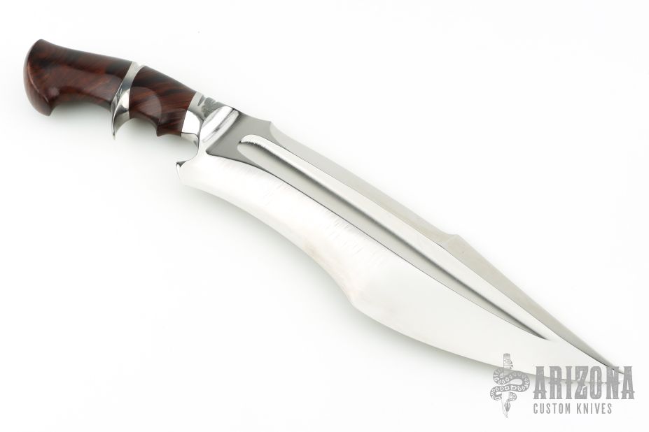This Sub-Hilt Fighter by Samuel Lurquin features a satin finished recurve blade with sharpened top edge, .291" blade stock and 3.5" blade depth, hidden tang construction. The handle has a stainless steel guard and sub-hilt with a desert ironwood burl grip. Beautiful handle contouring. Excellent condition.