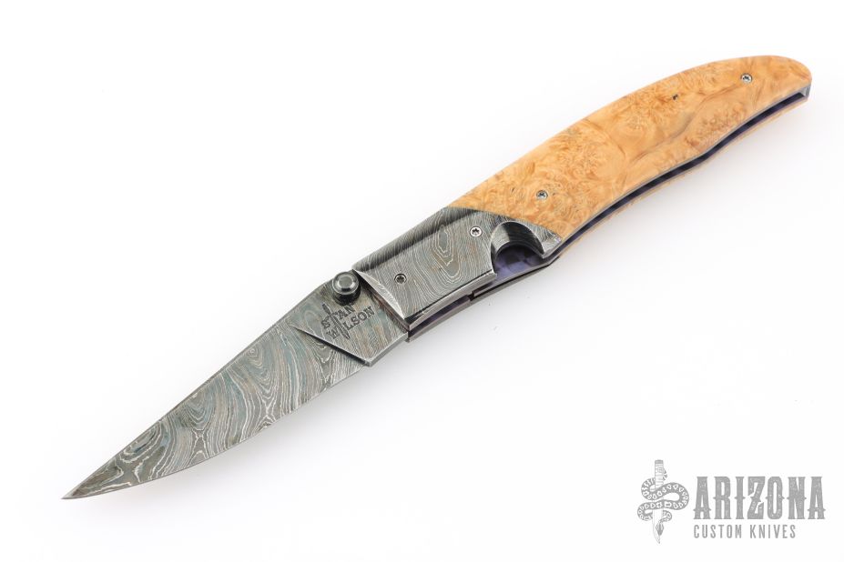 This beautiful knife, by Stan Wilson features a Damascus blade with a single thumb stud. The handle has Damascus dovetailed bolsters, presentation grade box elder burl scales, anodized titanium liners with jeweled interiors, and Damascus backspacer. Smooth action, nice fit and finish, nice detent, lockup and blade seating. Includes zipper case and printout. Excellent condition.