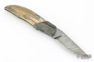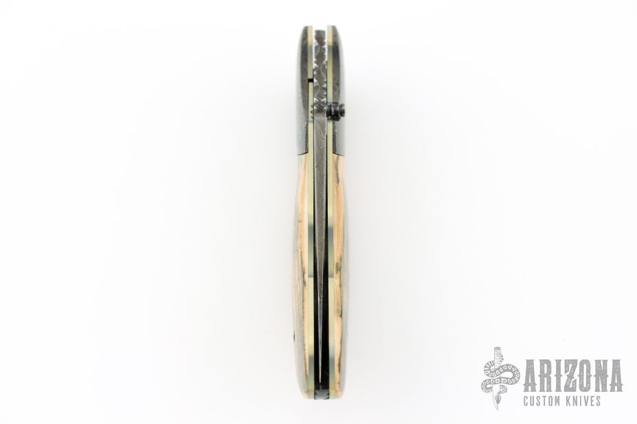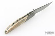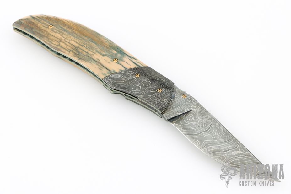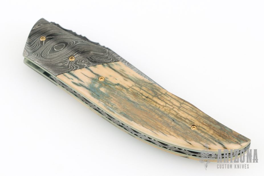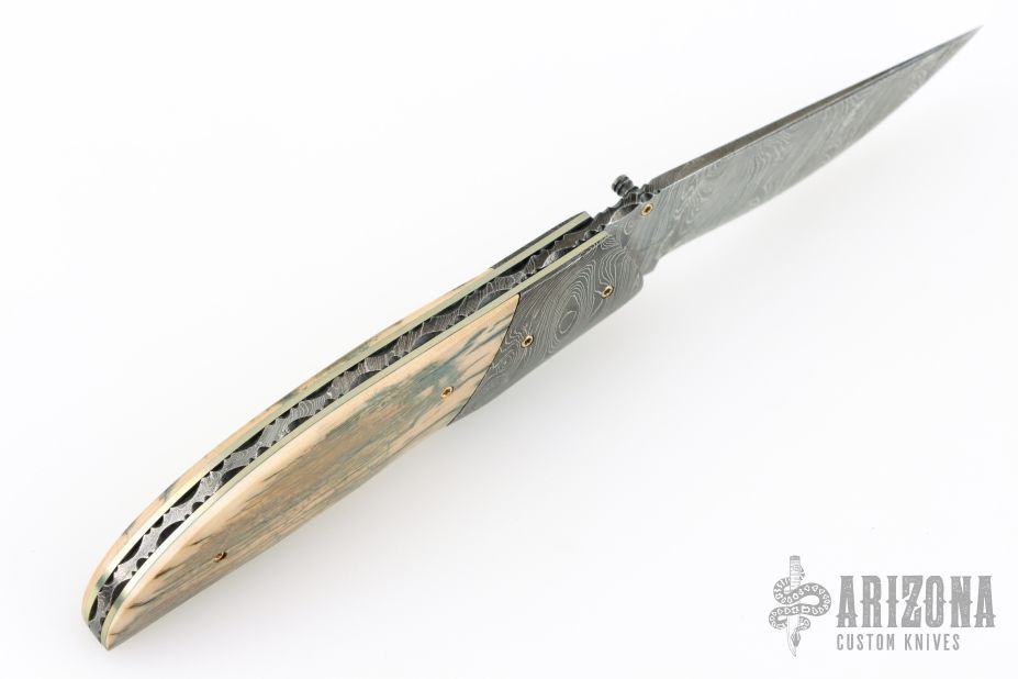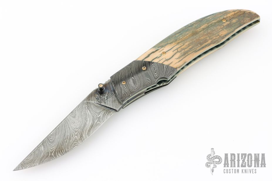 "All my life I have been a maker of many things, a jack-of-all-trades if you will. The idea of making a knife had been with me for a long time. Ever since I was a small boy I have always carried a knife, to me it was an Indispensable tool, never to be without. Later on in years, it was a good friend & hunting partner who finally got me started in knife making, though he was unaware of it. Every time we went hunting he would tell anyone who would listen about his knife, an old Rudy Ruana. The knife I carried at that time was nothing special, so one day after hearing one of his stories for umpteenth time I decided to make a knife of my own. I was going to apply all my crafting skills to this task. Little did I know that what I was plunging into was first going to evolve from a hobby, to an obsession, to something that would become my livelihood. That first knife was made from scavenged materials. A chainsaw bar for the blade, a copper electrode was made into the guard, the handle cut from an old rosewood picture frame. It took months of trial and error to finish that knife, but Upon completion of the first, I felt challenged to make another, but better. This is and always will be my creed. I promise to deliver each knife better than the last. That is the true challenge of what drives me today, to deliver the best I can. So I will go any length to ensure satisfaction and deliver what is truly a hand crafted knife. My choice of materials for my knives are natural and exotic handle materials such as pearl, bone, ivory or fine burlwood combined with a Damascus blade. All my knives are made by stock-removal, free hand ground and hand finished. I do not work off of set patterns, but from a simple drawing. This takes a little more time but it also allows me to be more creative and have full control to make slight changes to each custom knife, obviously as result no two knives are ever identical. My first knife was it was once described by another knife maker as organic in design. My basic designs still reflect that organic flow, graceful curves and a minimum of straight lines. I maintain sole authorship on all my knives with the exception of the Damascus I use and heat-treating of stainless steels. Like many makers I began with fixed blades, as I gained skills I moved into folders, then autos. Lately I have taken to building my folders with all the screws hidden."