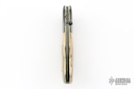 This beautiful knife, by Stan Wilson, features a Damascus recurve blade, fileworked blade spine with a single thumb stud. The handle has Damascus bolsters, gorgeous premium mammoth ivory scales and a file worked Damascus backspacer. The Titanium liners have been jeweled and anodized. The screws are plated with 24k Gold. Smooth action, nice fit and finish, nice detent, lockup and blade seating. Includes Velcro case and printout. Excellent condition.