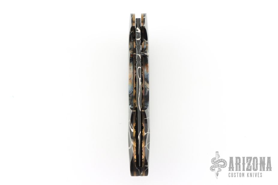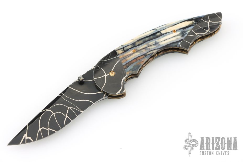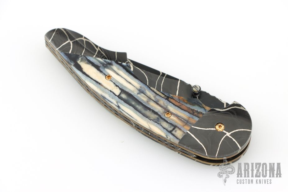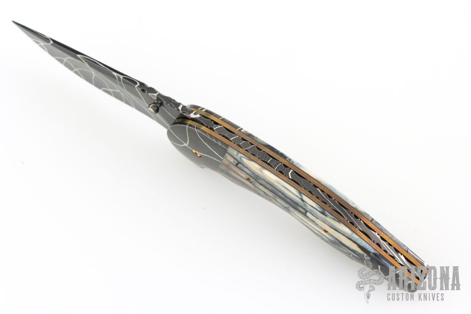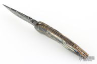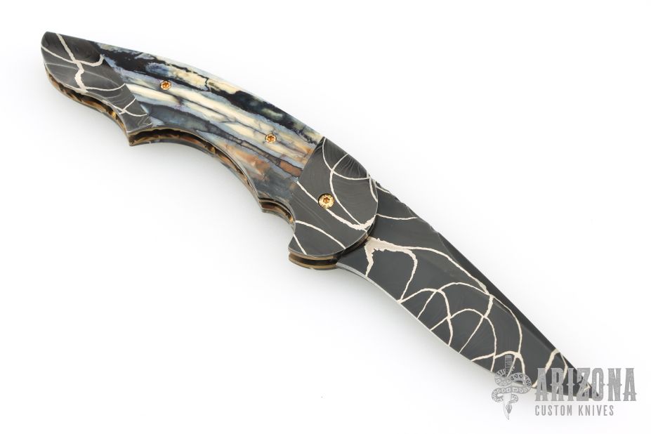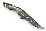 My choice of materials for my knives are natural and exotic handle materials such as pearl, bone, ivory or fine burlwood combined with a Damascus blade. All my knives are made by stock-removal, free hand ground and hand finished. I do not work off of set patterns, but from a simple drawing. This takes a little more time but it also allows me to be more creative and have full control to make slight changes to each custom knife, obviously as result no two knives are ever identical. My first knife was it was once described by another knife maker as organic in design. My basic designs still reflect that organic flow, graceful curves and a minimum of straight lines. I maintain sole authorship on all my knives with the exception of the Damascus I use and heat-treating of stainless steels. Like many makers I began with fixed blades, as I gained skills I moved into folders, then autos. Lately I have taken to building my folders with all the screws hidden."