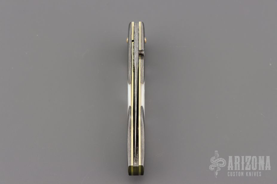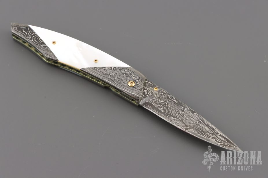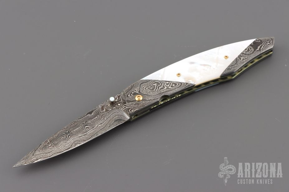 My choice of materials for my knives are natural and exotic handle materials such as pearl, bone, ivory or fine burlwood combined with a Damascus blade. All my knives are made by stock-removal, free hand ground and hand finished. I do not work off of set patterns, but from a simple drawing. This takes a little more time but it also allows me to be more creative and have full control to make slight changes to each custom knife, obviously as result no two knives are ever identical. My first knife was it was once described by another knife maker as organic in design. My basic designs still reflect that organic flow, graceful curves and a minimum of straight lines. I maintain sole authorship on all my knives with the exception of the Damascus I use and heat-treating of stainless steels. Like many makers I began with fixed blades, as I gained skills I moved into folders, then autos. Lately I have taken to building my folders with all the screws hidden."