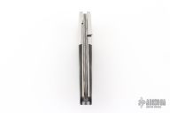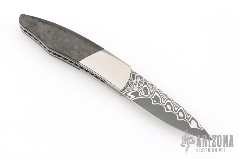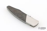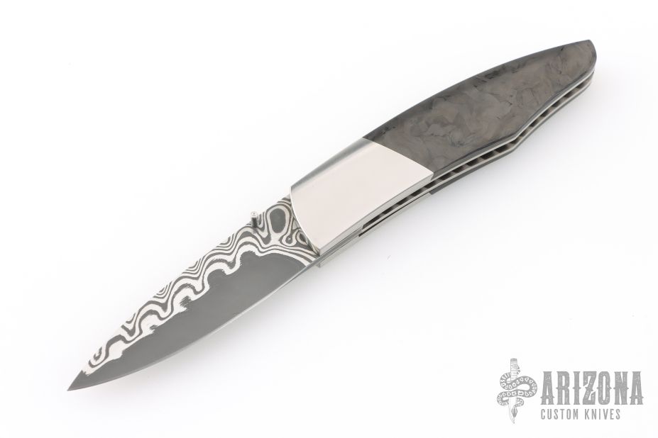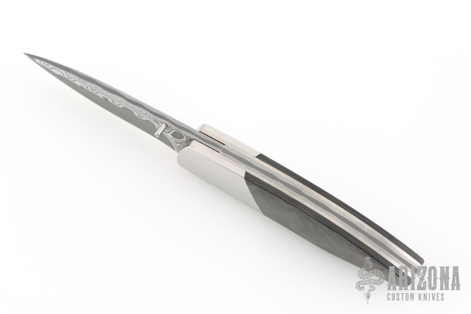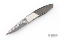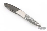 My choice of materials for my knives are natural and exotic handle materials such as pearl, bone, ivory or fine burlwood combined with a Damascus blade. All my knives are made by stock-removal, free hand ground and hand finished. I do not work off of set patterns, but from a simple drawing. This takes a little more time but it also allows me to be more creative and have full control to make slight changes to each custom knife, obviously as result no two knives are ever identical. My first knife was it was once described by another knife maker as organic in design. My basic designs still reflect that organic flow, graceful curves and a minimum of straight lines. I maintain sole authorship on all my knives with the exception of the Damascus I use and heat-treating of stainless steels. Like many makers I began with fixed blades, as I gained skills I moved into folders, then autos. Lately I have taken to building my folders with all the screws hidden."