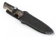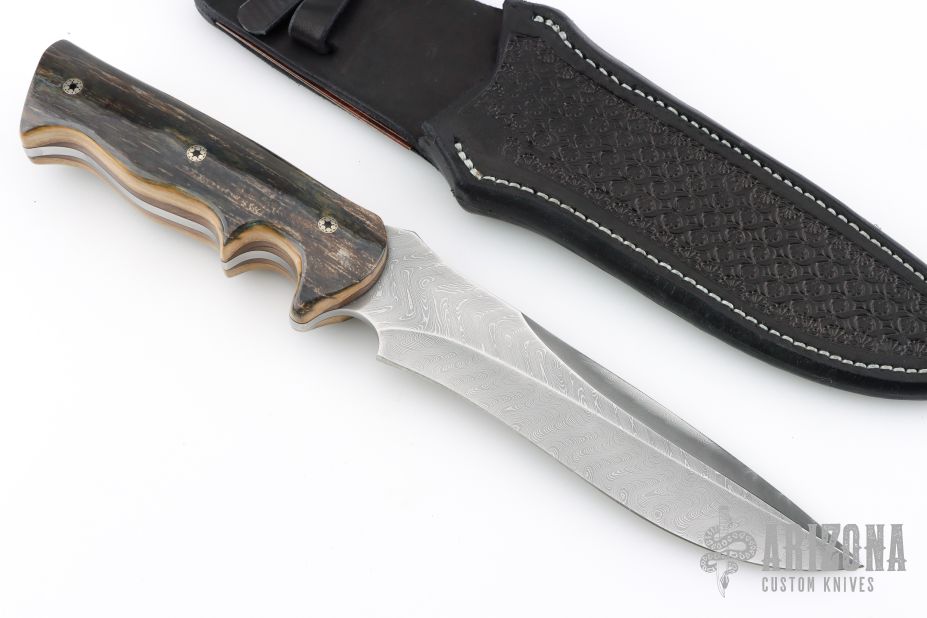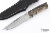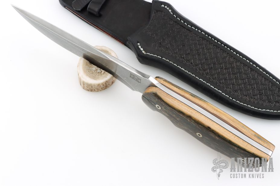 This Custom War Blade by Walter Brend features a hand ground Damascus blade with sharpened top edge, .198" blade stock and 1.784" blade depth, full tang construction. The handle has bark mammoth ivory scales with mosaic pins and black liners. Comes with a hand tooled black leather sheath by Masterpeace Leather, and a zippered case. Excellent condition.