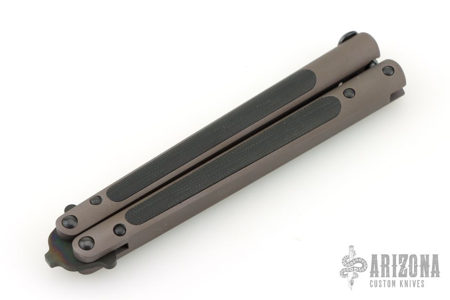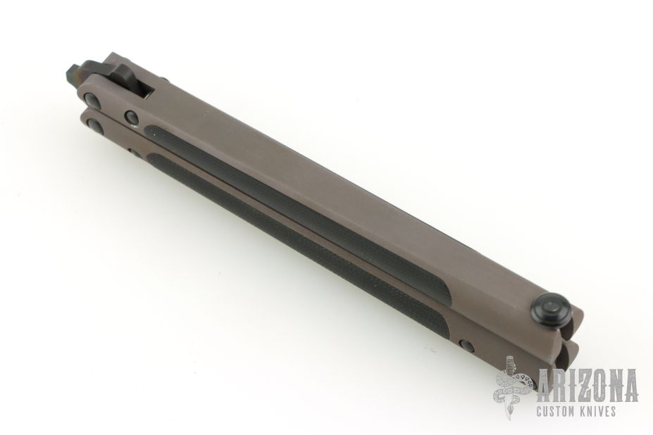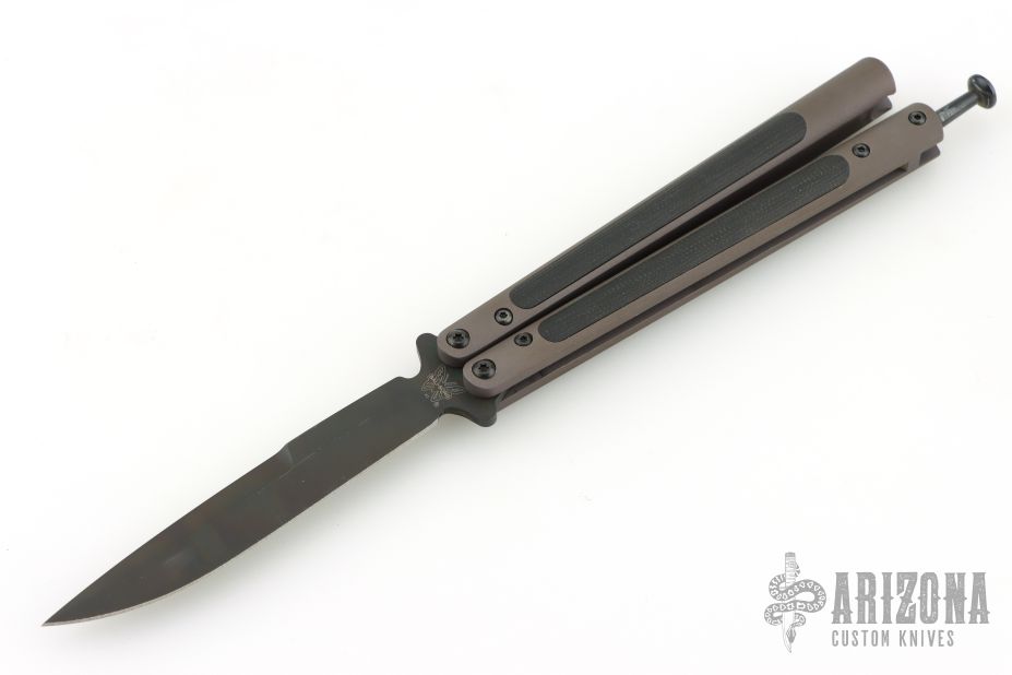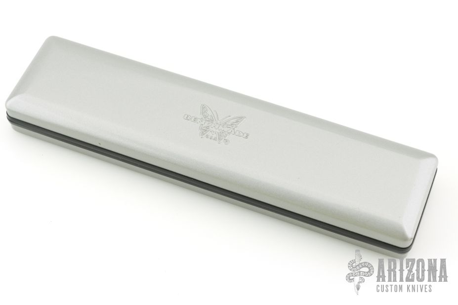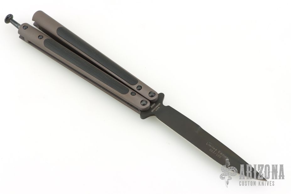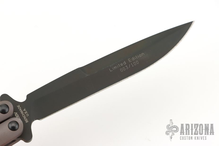 This Model 42-01 Balisong by Benchmade features a black boron carbide spear point blade with swedge. The handles are black aluminum with black G-10 inlays with spring T latch on pommel. Marked "Limited Edition 003/100" on blade. Includes a original clamshell box. A rare and hard to find piece. Has some light scuffs, otherwise excellent condition.