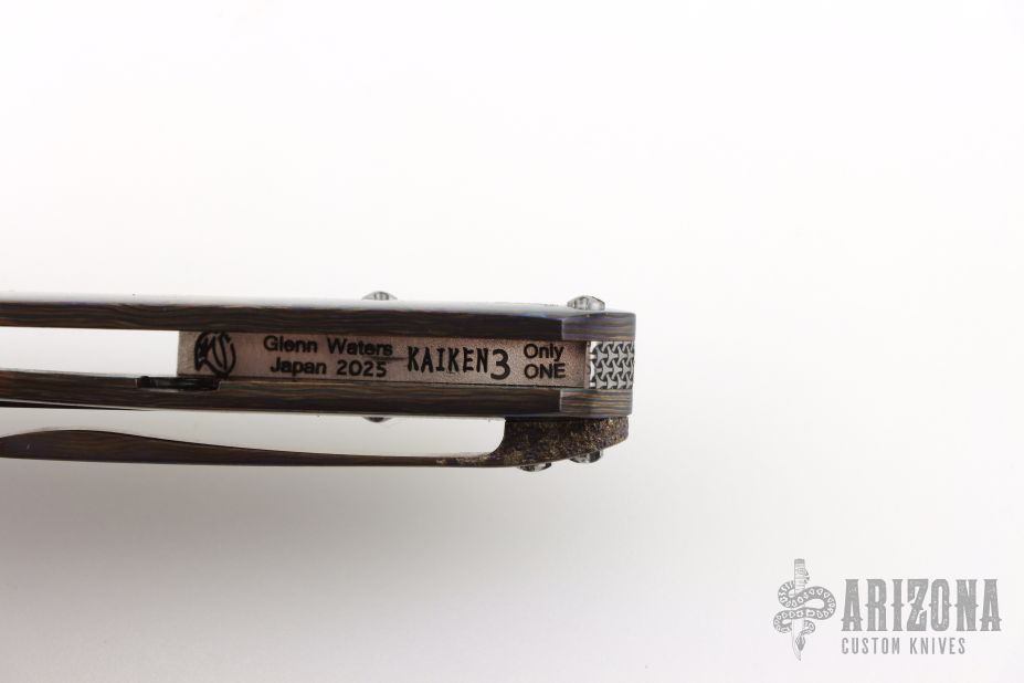 This Kaiken by Glenn Waters features a Damacore drop point blade with flipper and carbidized edge. The handle has black ZircTi covers, and tip up pocket clip with laser engraved backstrap, and custom pivot. Includes original box, tool, COA Dated 2025 and padded zippered case. Nice detent, lock up and blade seating. Excellent Condition.