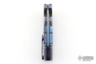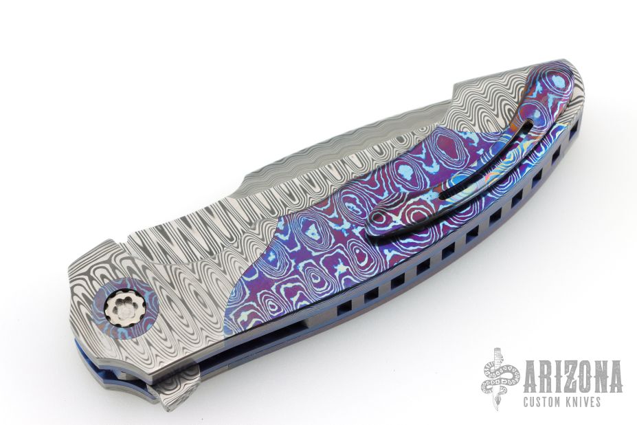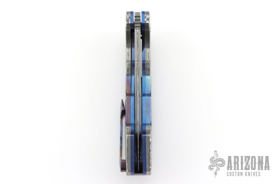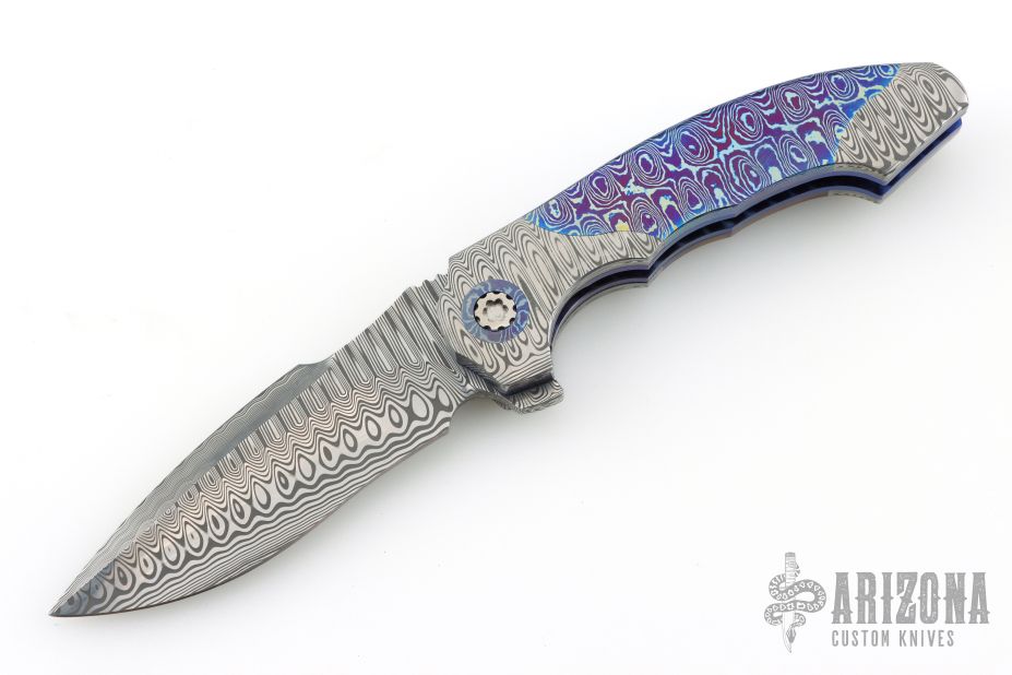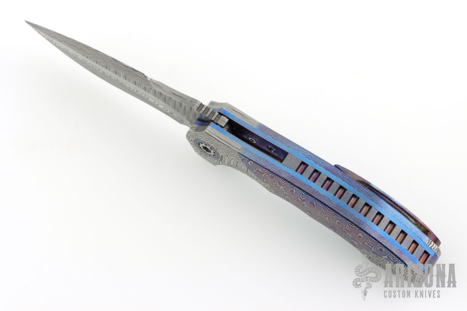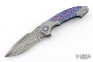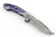 This gorgeous Archangel from Mr. Todd Fischer Sr features a Damasteel blade with false top edge, notched thumbrest and a flipper. The handle has Damasteel bolsters with MokuTi pivot collars, MokuTi scales, anodized titanium liners with jeweled interiors, notched MokuTi backspacer, and a tip up MokuTi clip. There are no visible screws on this knife except for the pivot. Blade is centered when closed and locks up with no play. Nice crisp detent. Very smooth action thanks to Mr. Fischer's bearing system. Excellent Condition. Comes with a zippered case.