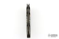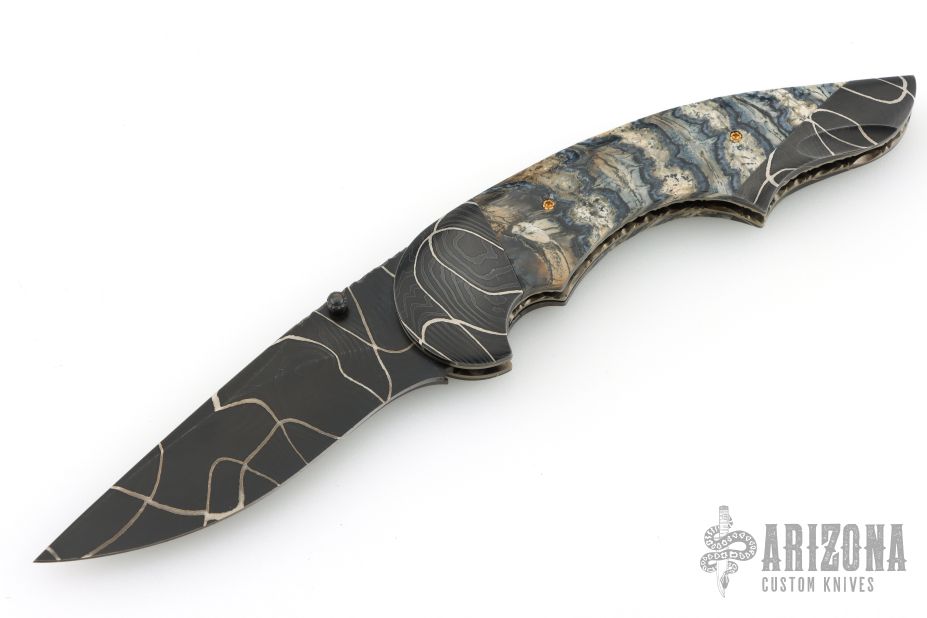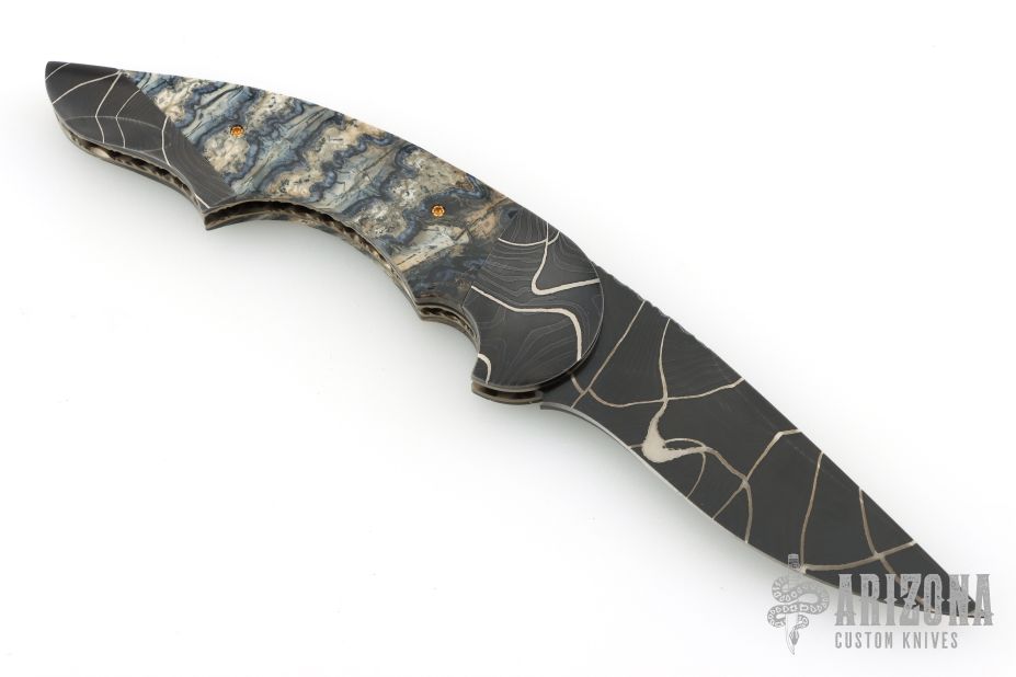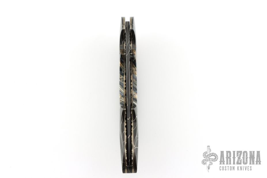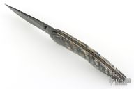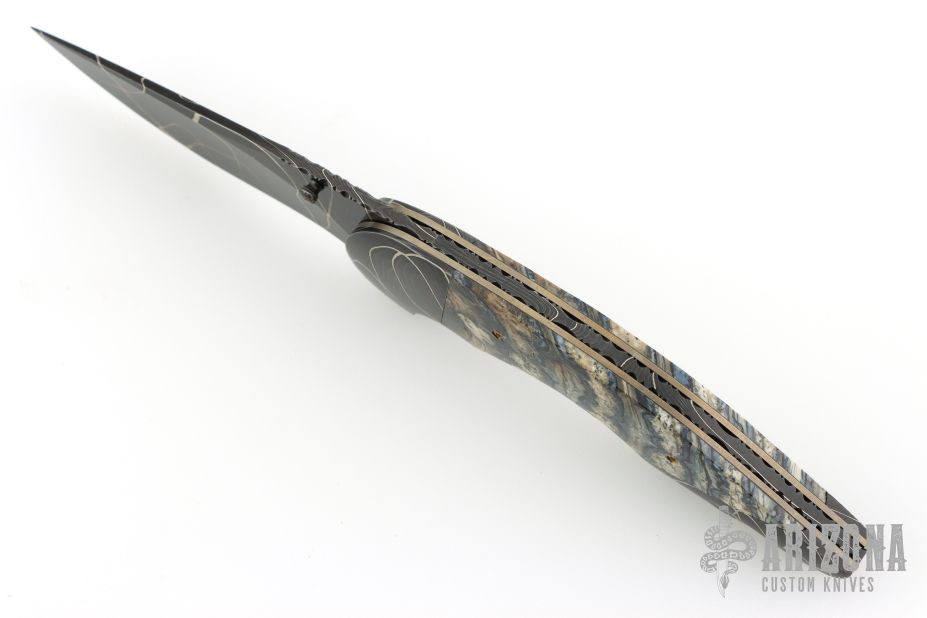 "All my life I have been a maker of many things, a jack-of-all-trades if you will. The idea of making a knife had been with me for a long time. Ever since I was a small boy I have always carried a knife, to me it was an Indispensable tool, never to be without. Later on in years, it was a good friend & hunting partner who finally got me started in knife making, though he was unaware of it. Every time we went hunting he would tell anyone who would listen about his knife, an old Rudy Ruana. The knife I carried at that time was nothing special, so one day after hearing one of his stories for umpteenth time I decided to make a knife of my own. I was going to apply all my crafting skills to this task. Little did I know that what I was plunging into was first going to evolve from a hobby, to an obsession, to something that would become my livelihood. That first knife was made from scavenged materials. A chainsaw bar for the blade, a copper electrode was made into the guard, the handle cut from an old rosewood picture frame. It took months of trial and error to finish that knife, but Upon completion of the first, I felt challenged to make another, but better. This is and always will be my creed. I promise to deliver each knife better than the last. That is the true challenge of what drives me today, to deliver the best I can. So I will go any length to ensure satisfaction and deliver what is truly a hand crafted knife. My choice of materials for my knives are natural and exotic handle materials such as pearl, bone, ivory or fine burlwood combined with a Damascus blade. All my knives are made by stock-removal, free hand ground and hand finished. I do not work off of set patterns, but from a simple drawing. This takes a little more time but it also allows me to be more creative and have full control to make slight changes to each custom knife, obviously as result no two knives are ever identical. My first knife was it was once described by another knife maker as organic in design. My basic designs still reflect that organic flow, graceful curves and a minimum of straight lines. I maintain sole authorship on all my knives with the exception of the Damascus I use and heat-treating of stainless steels. Like many makers I began with fixed blades, as I gained skills I moved into folders, then autos. Lately I have taken to building my folders with all the screws hidden."