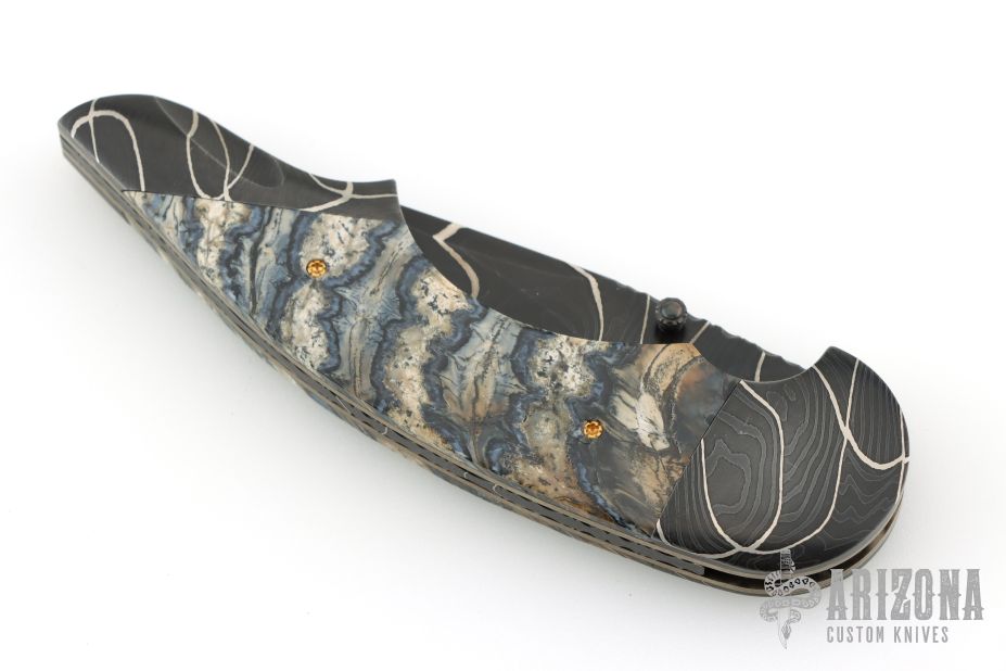 This Advisor by Stan Wilson, features a Robert Eggerling Damascus blade, fileworked blade spine with a single thumb stud with mammoth tooth inlay. The handle has matching Robert Eggerling Damascus bolsters with blind screws, premium mammoth tooth scales, fileworked matching Damascus backspacer, fileworked and anodized titanium liners with jeweled interiors. The screws are fileworked and plated with 24k Gold. 14k Gold name plate in backstrap. Smooth action, nice fit and finish, nice detent, lockup and blade seating. Comes with a zippered case. Excellent condition.