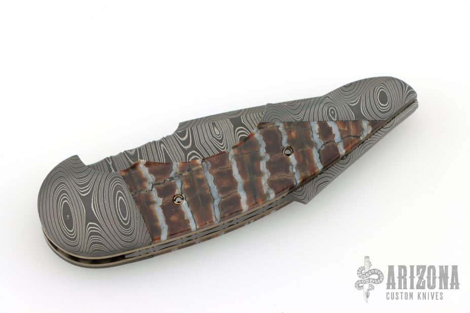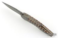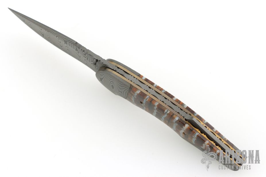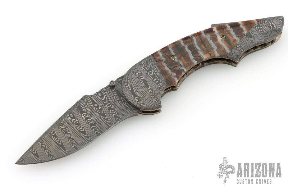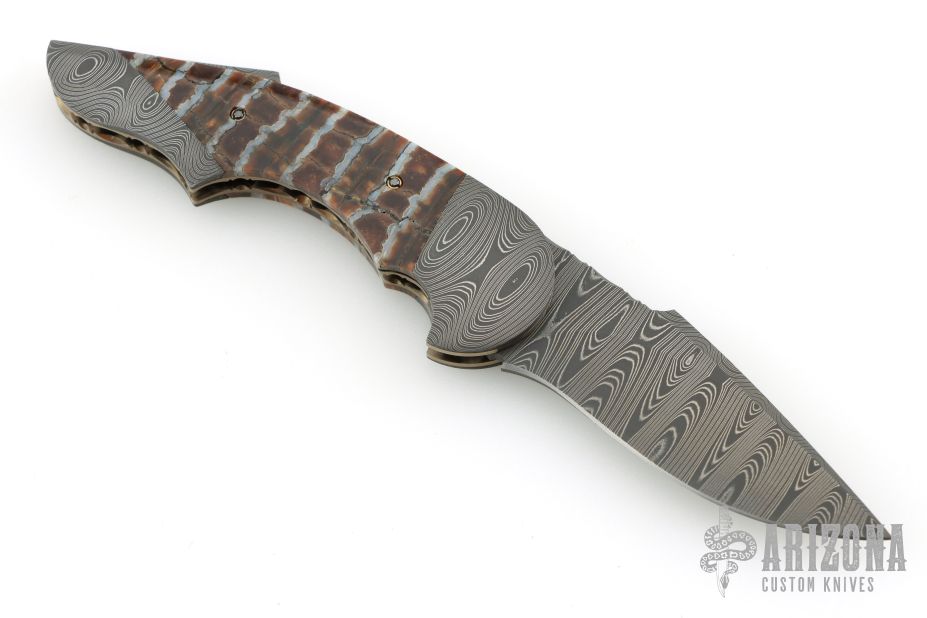 "All my life I have been a maker of many things, a jack-of-all-trades if you will. The idea of making a knife had been with me for a long time. Ever since I was a small boy I have always carried a knife, to me it was an Indispensable tool, never to be without. Later on in years, it was a good friend & hunting partner who finally got me started in knife making, though he was unaware of it. Every time we went hunting he would tell anyone who would listen about his knife, an old Rudy Ruana. The knife I carried at that time was nothing special, so one day after hearing one of his stories for umpteenth time I decided to make a knife of my own. I was going to apply all my crafting skills to this task. Little did I know that what I was plunging into was first going to evolve from a hobby, to an obsession, to something that would become my livelihood. That first knife was made from scavenged materials. A chainsaw bar for the blade, a copper electrode was made into the guard, the handle cut from an old rosewood picture frame. It took months of trial and error to finish that knife, but Upon completion of the first, I felt challenged to make another, but better. This is and always will be my creed. I promise to deliver each knife better than the last. That is the true challenge of what drives me today, to deliver the best I can. So I will go any length to ensure satisfaction and deliver what is truly a hand crafted knife. My choice of materials for my knives are natural and exotic handle materials such as pearl, bone, ivory or fine burlwood combined with a Damascus blade. All my knives are made by stock-removal, free hand ground and hand finished. I do not work off of set patterns, but from a simple drawing. This takes a little more time but it also allows me to be more creative and have full control to make slight changes to each custom knife, obviously as result no two knives are ever identical. My first knife was it was once described by another knife maker as organic in design. My basic designs still reflect that organic flow, graceful curves and a minimum of straight lines. I maintain sole authorship on all my knives with the exception of the Damascus I use and heat-treating of stainless steels. Like many makers I began with fixed blades, as I gained skills I moved into folders, then autos. Lately I have taken to building my folders with all the screws hidden."