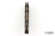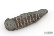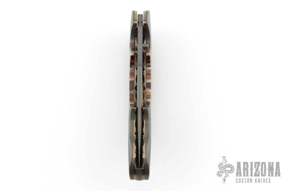 This Gen'ts Advisor III by Stan Wilson features a Devin Thomas Stainless Damascus blade, fileworked blade spine with a single thumb stud with black diamond inlay. The handle has matching Devin Thomas Stainless Damascus bolsters with blind screws, premium mammoth tooth scales, fileworked matching Damascus backspacer, fileworked and anodized titanium liners with jeweled interiors. The screws are 24k Gold plated with black diamond inlays. 14k Gold name plate in backstrap. Smooth action, nice fit and finish, nice detent, lockup and blade seating. Comes with a zippered case. Excellent condition.