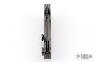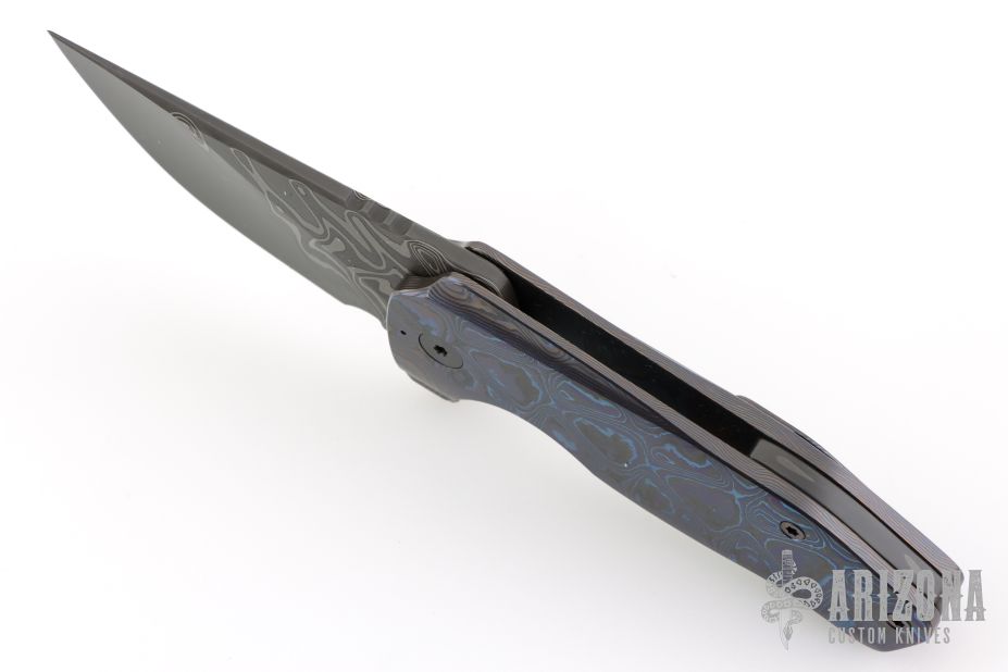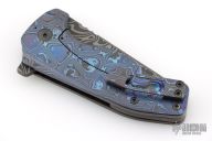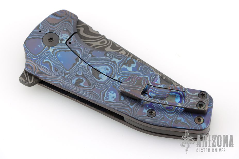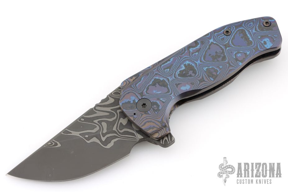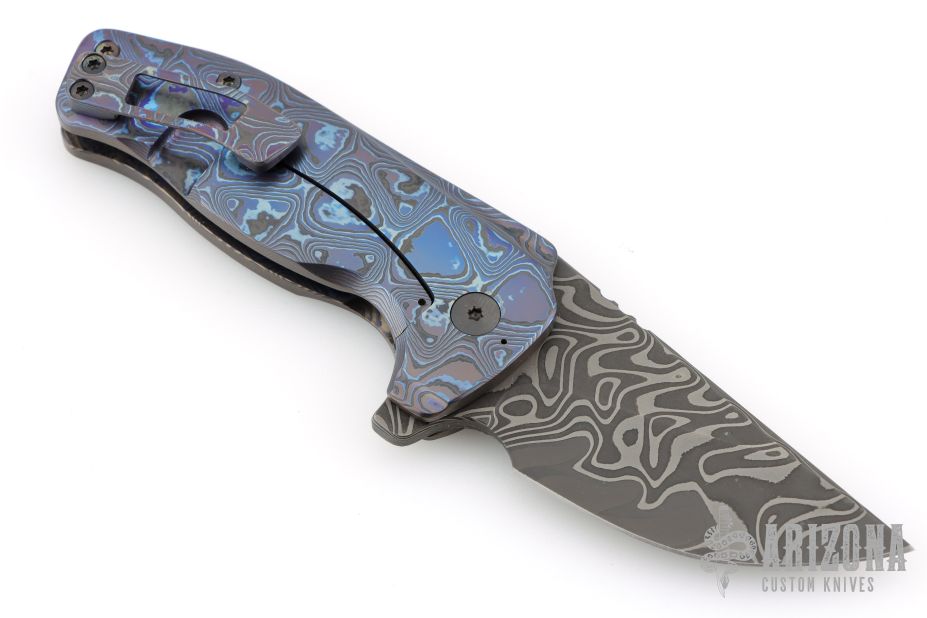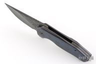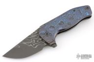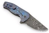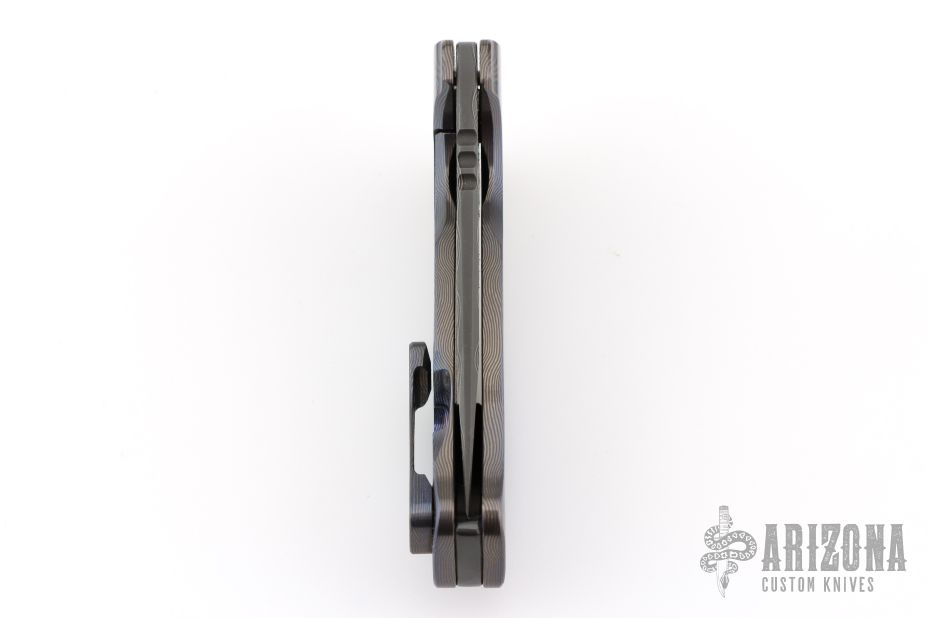 This Savage flipper by Hellion Machine Collective features a San-Mai Damascus blade with notched thumbrest and flipper. The handle has a Zircuti frame, with matching tip up clip and zirconium hardware/backspacer. Rides on bearings, nice detent, lockup and blade seating. Comes with a zippered case. Excellent Condition.